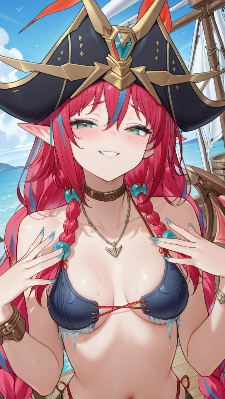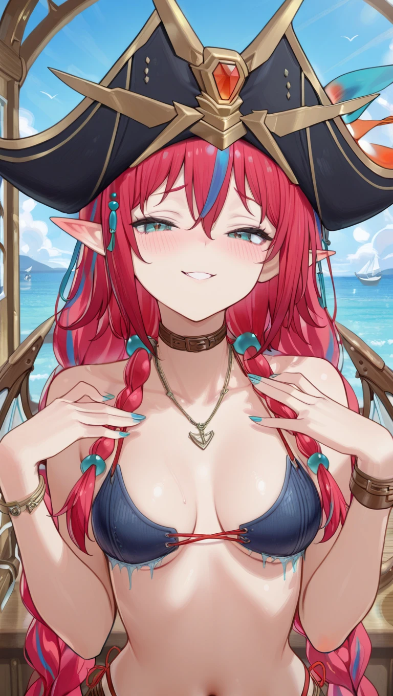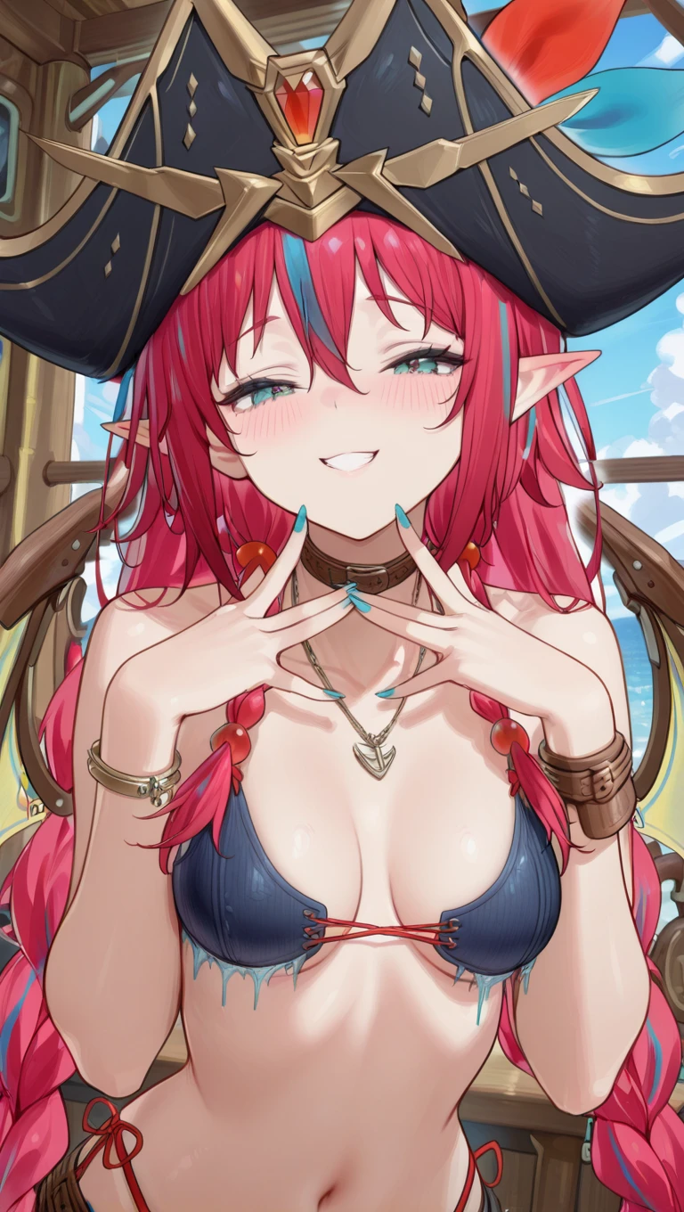 pirate hat,very long hair,red hair,multicolored hair,streaked hair,twin braids,pointy ears,hair between eyes,aqua eyes