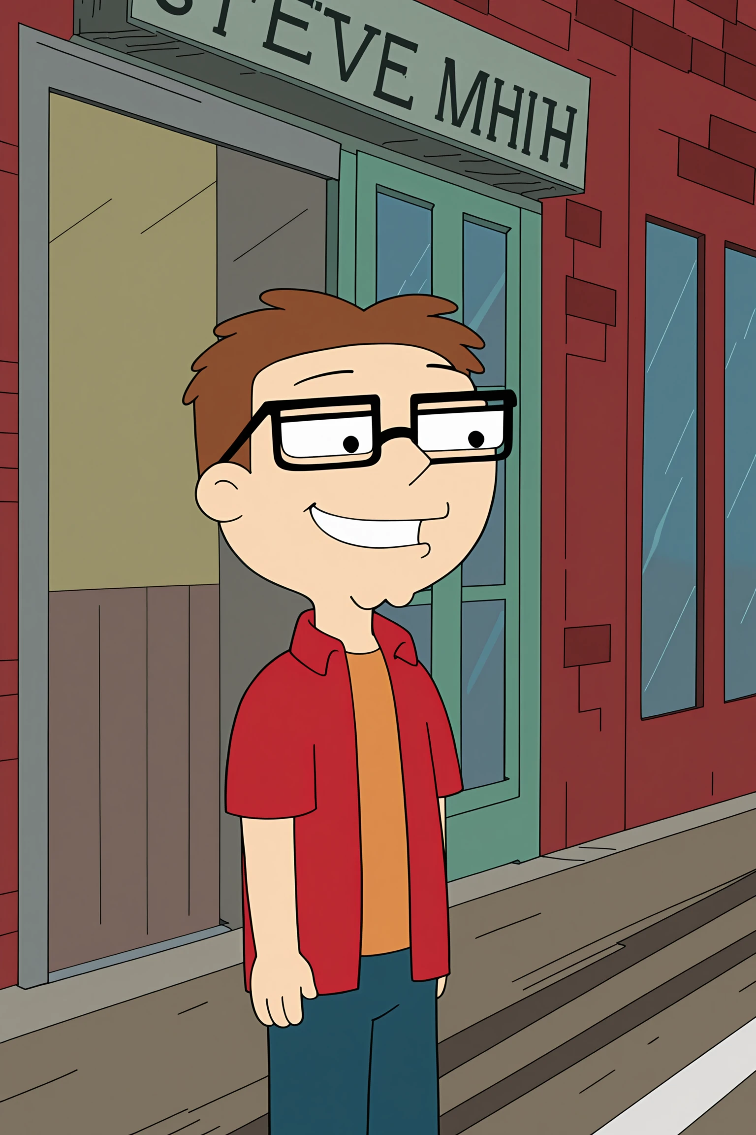 Steve Smith (character), 1boy, solo, brown hair, black eyes, Steve main outfit, glasses, open clothes, open shirt, pants, red shirt
