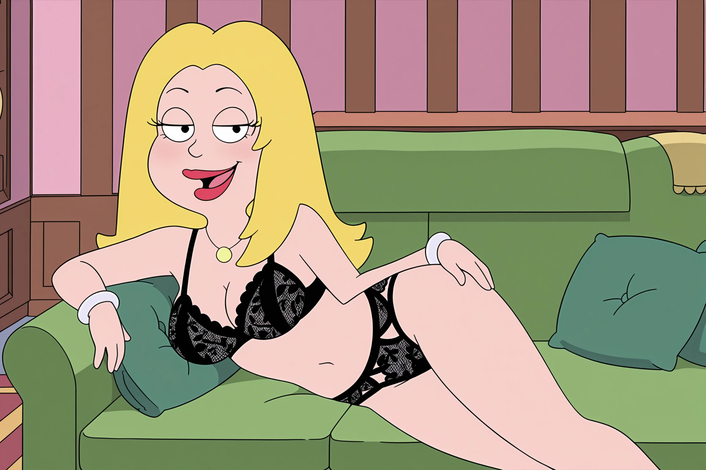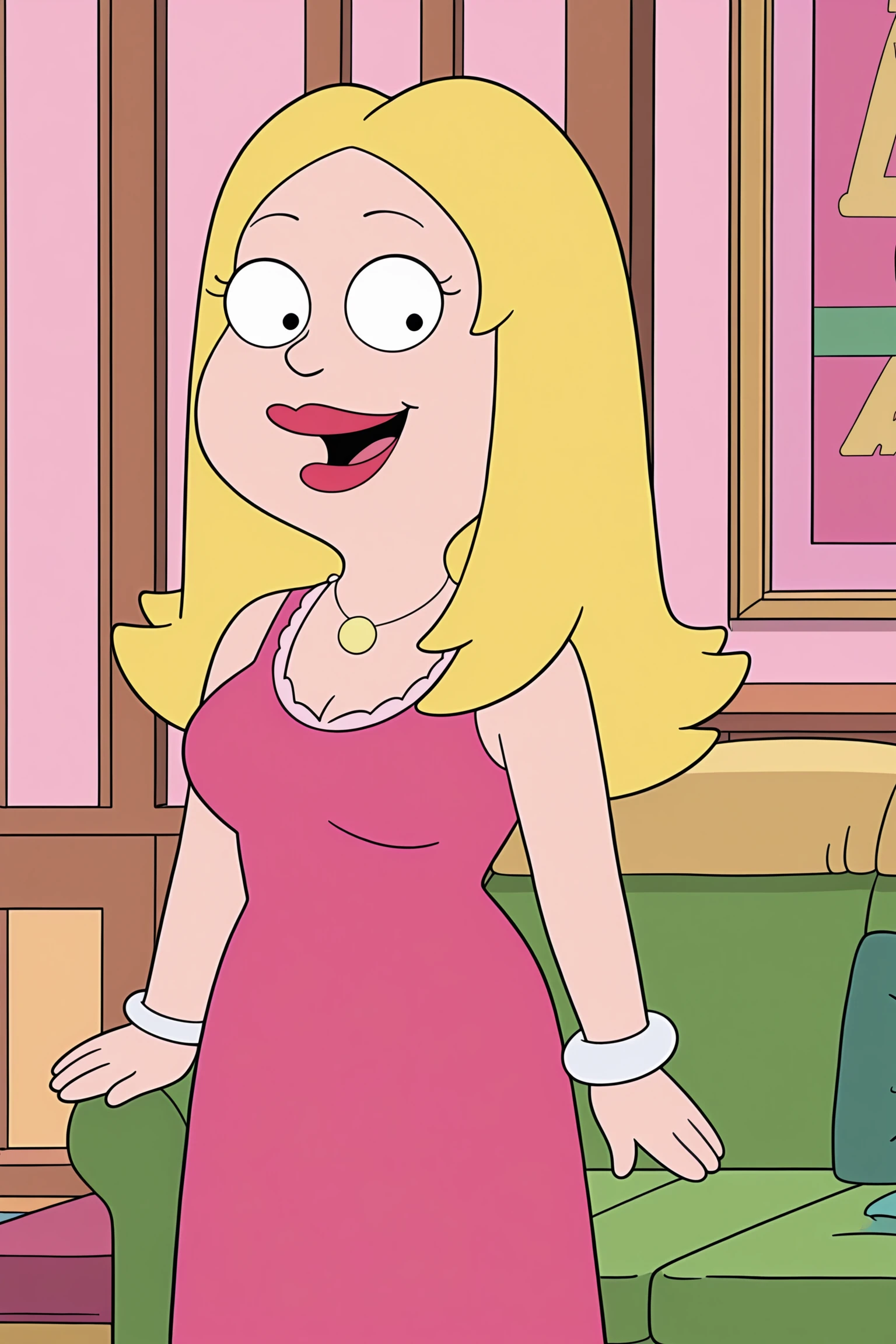 Francine Smith (character), 1girl, solo, blonde hair, black eyes | Francine main outfit, dress, jewelry, pink dress, necklace, long hair, bracelet, lipstick, red lips, makeup, sleeveless