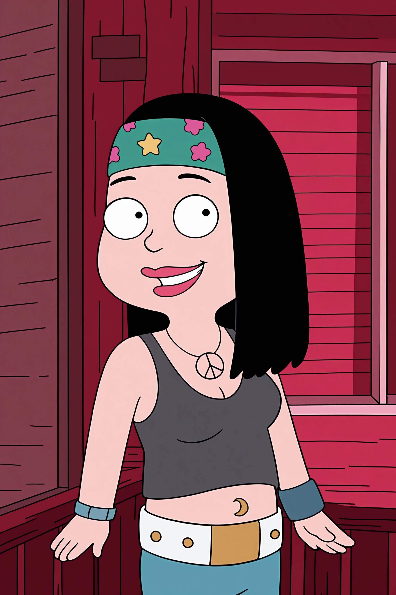 Hayley Smith (character), 1girl, solo, black hair, black eyes | Hayley main outfit, jewelry, headband, wristband, lipstick, necklace, midriff, tank top, makeup, pants, star (symbol)