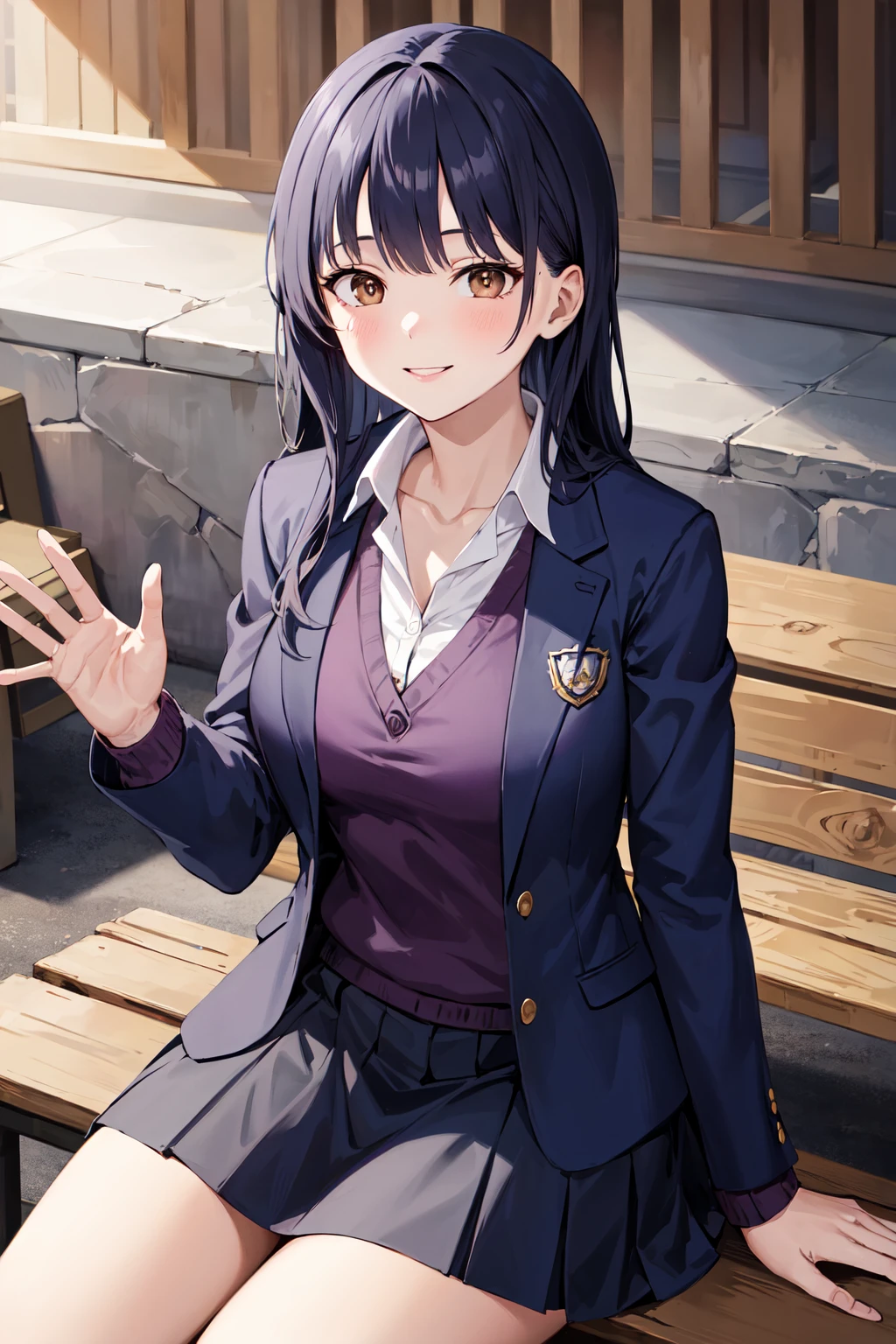 outfit2 (not perfect)aaanna, long hair, brown eyes, collarbone, collared shirt, purple sweater, blue jacket, blazer, open jacket, long sleeves, pleated skirt, blue skirt, miniskirt