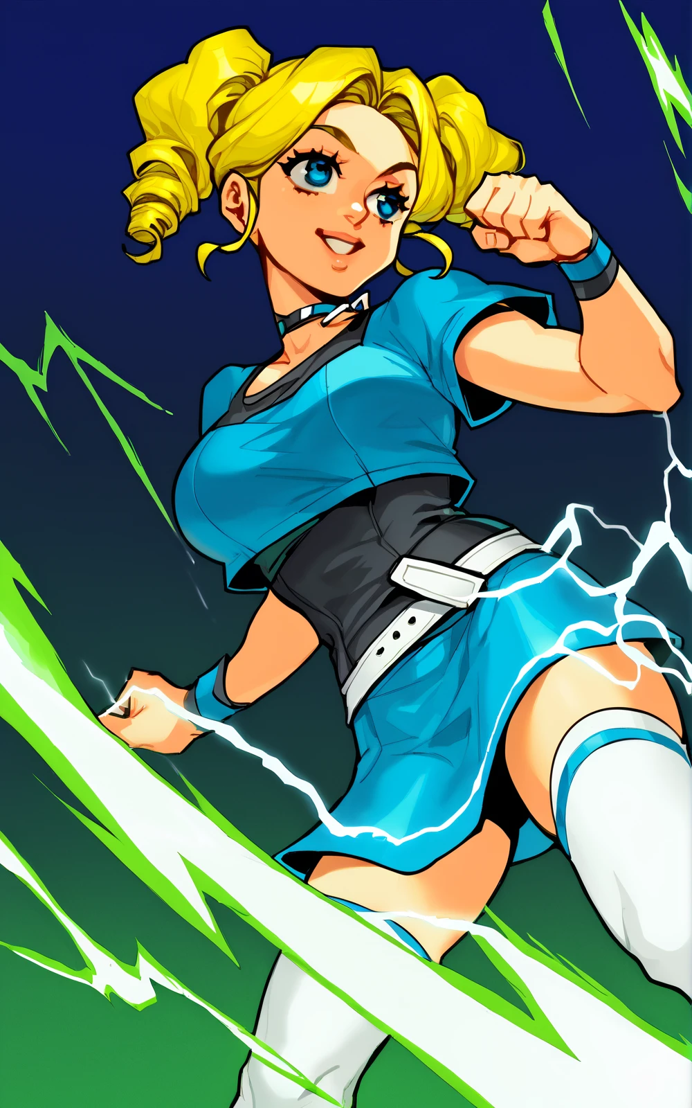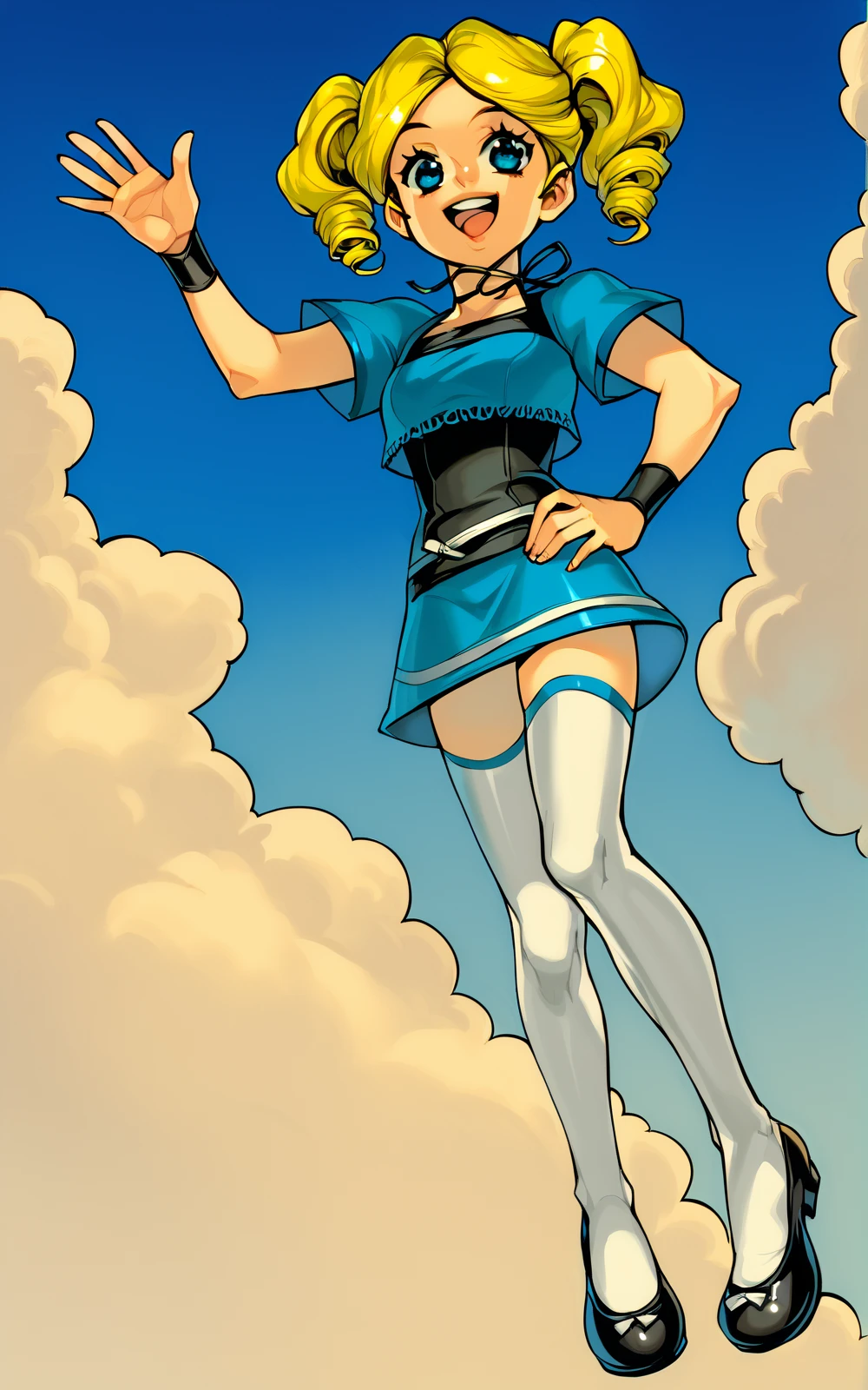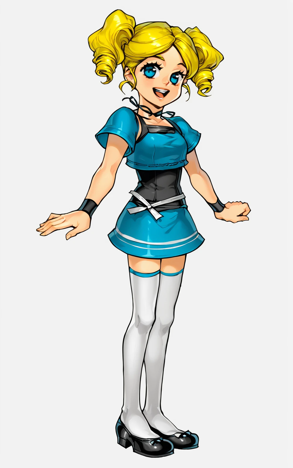 For her Outfit: black footwear, mary janes, white thighhighs, thighhighs, skirt, blue skirt, white belt, shirt, black shirt, blue crop top, crop top, short sleeves, choker, wristband, black wristband, white belt