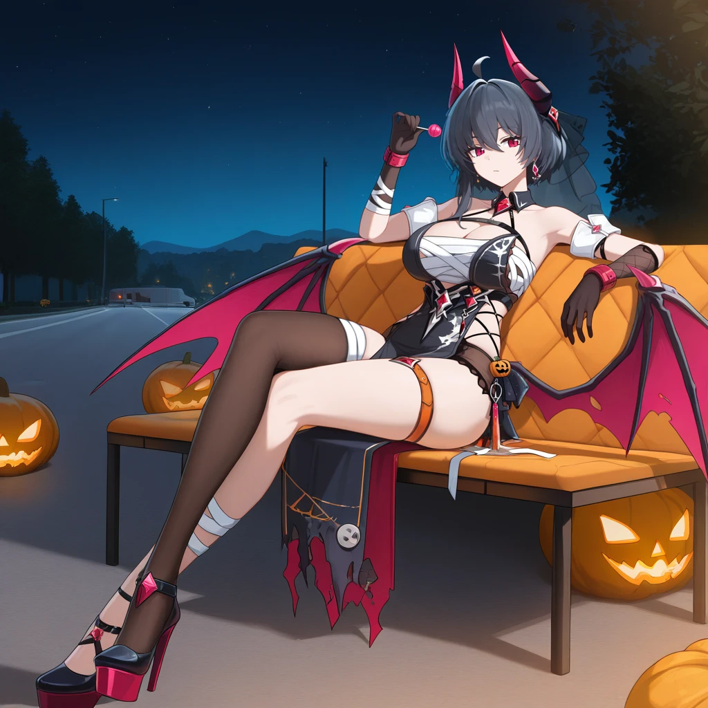 RvnHi3, Fol001, Rv_Hal, red eyes, short hair, ahoge, black hair, sleeveless dress, black dress, metal cuffs, chest sarashi, clothing cutout, asymmetrical legwear, cleavage, halterneck, detached collar, red gemstone, halloween costume, black underwear, black pelvic curtain, pins, jewelry, detached sleeves, white sleeves, short sleeves, demon horns, demon wings, low wings, black veil, single thighhigh, brown thighhighs, asymmetrical gloves, cuffs, chain, orange thigh strap, bandaged arm, bandaged leg, black gloves, elbow gloves, side cutout, bare shoulders, Bartender Outfit:
