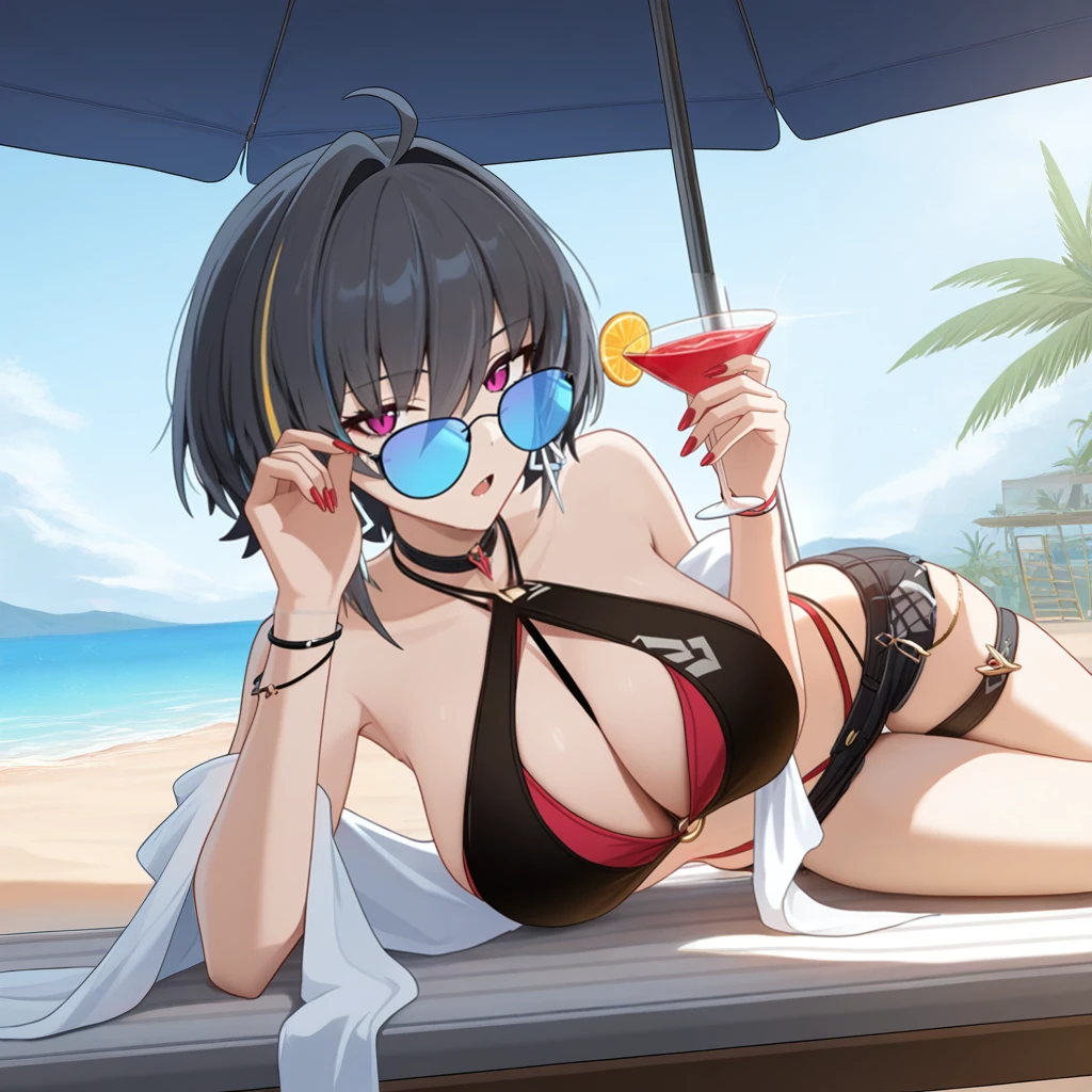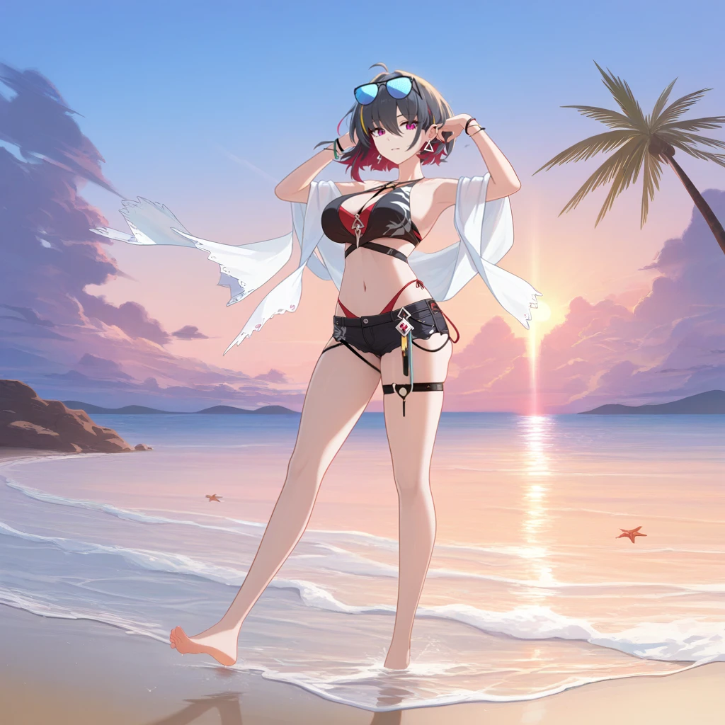 RvnHi3, Fol002, Rv_Swm, black bikini, streaked hair, multicolored hair, black hair, short hair, ahoge, purple eyes, white earrings, blue-tinted eyewear, sunglasses, criss-cross wrist straps, swimsuit, layered bikini, red bikini, o-ring, between breasts, halter bikini, panty straps, red straps, short shorts, black shorts, thigh straps, white shawl, bracelets, Disclaimer: The bikini is supposed to be Black on top and Red below it, but Ai think it's genius and reverses it for no reason... Increase weight for "black bikini", helps a bit.