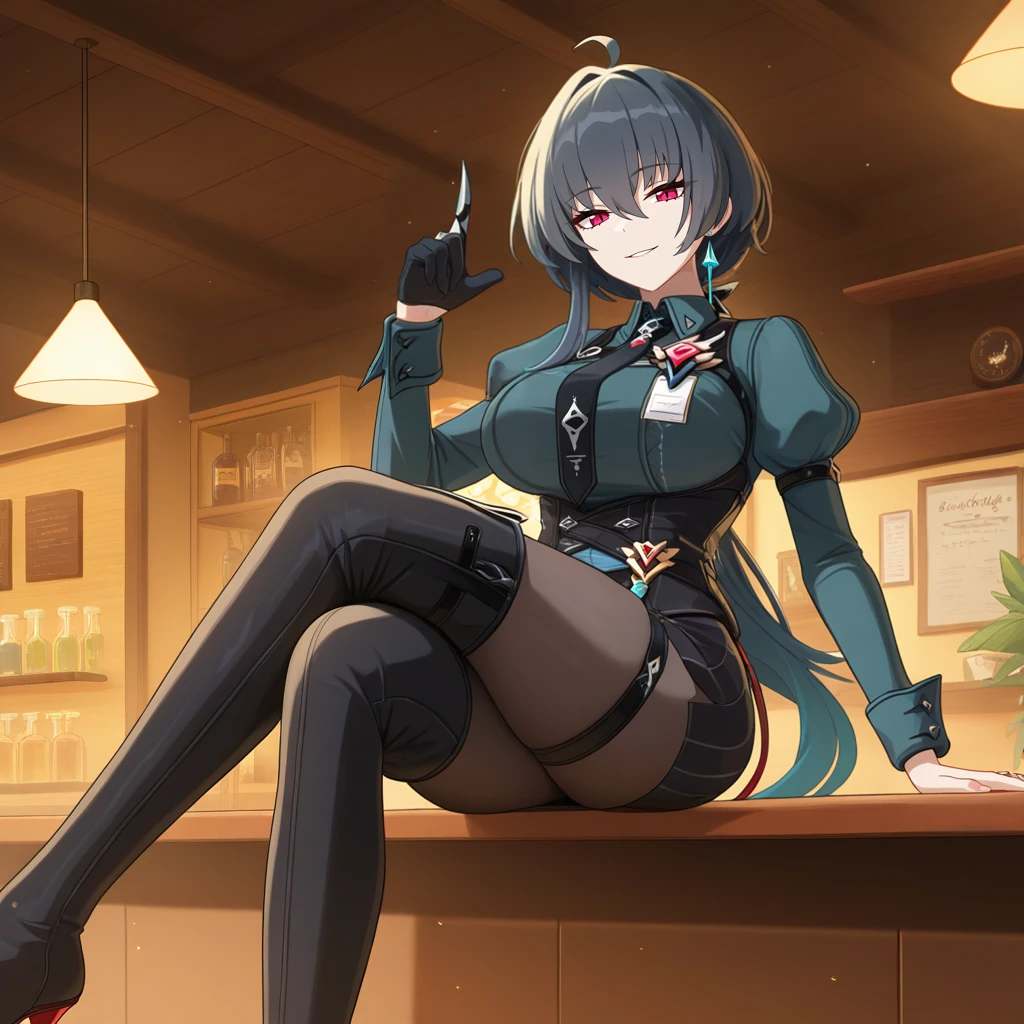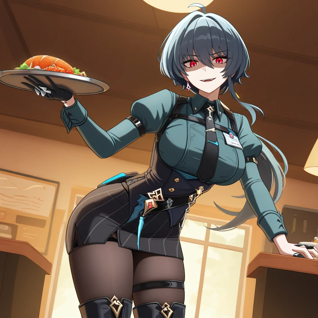 RvnHi3, Fol002, Rv_Brt, black hair, red eyes, ahoge, long hair, low ponytail, dark green shirt, collared shirt, black necktie, black vest, sleeveless vest, juliet sleeves, dark green sleeves, dark green wrist cuffs, eye (symbol), black belt, loose belt, miniskirt, black skirt, striped skirt, black thigh strap, black pantyhose, pantyhose, black footwear, black thigh boots, single glove, black glove, claw ring, Stigmata Swimsuit Outfit: