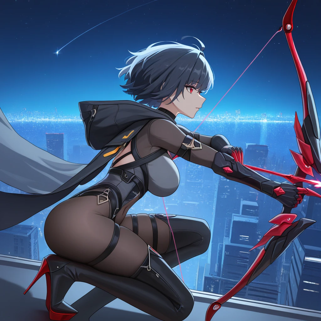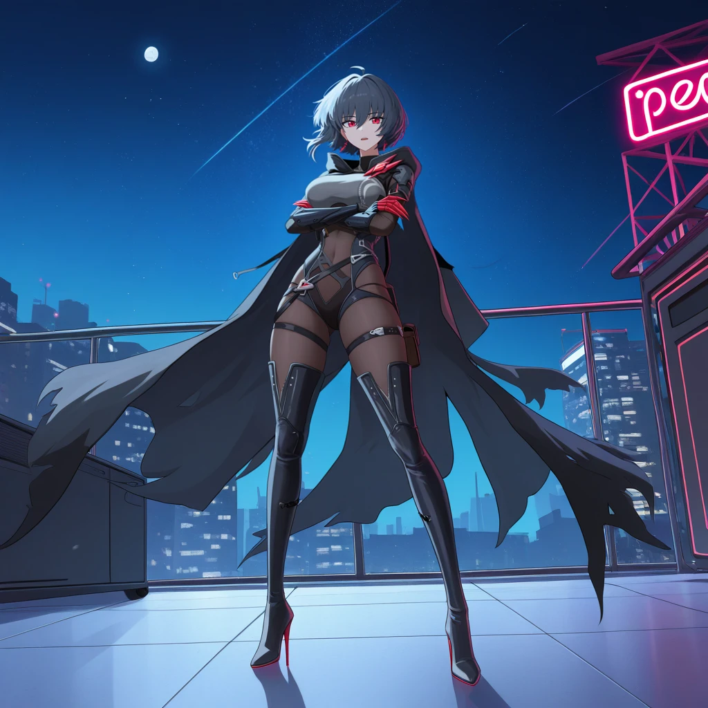 RvnHi3, Fol001, Rv_Def, short hair, black hair, red eyes, ahoge, hooded cloak, black cloak, black hood, black bodysuit, multiple belts, black belts, black straps, thigh straps, grey top, long sleeves, black sleeves, black gloves, turtleneck, thigh boots, black legwear, covered navel, black feather, red claws, black gauntlets, stomach cutout, black armor, black leotard, Optional: "hood up" or "hood down" your choice.