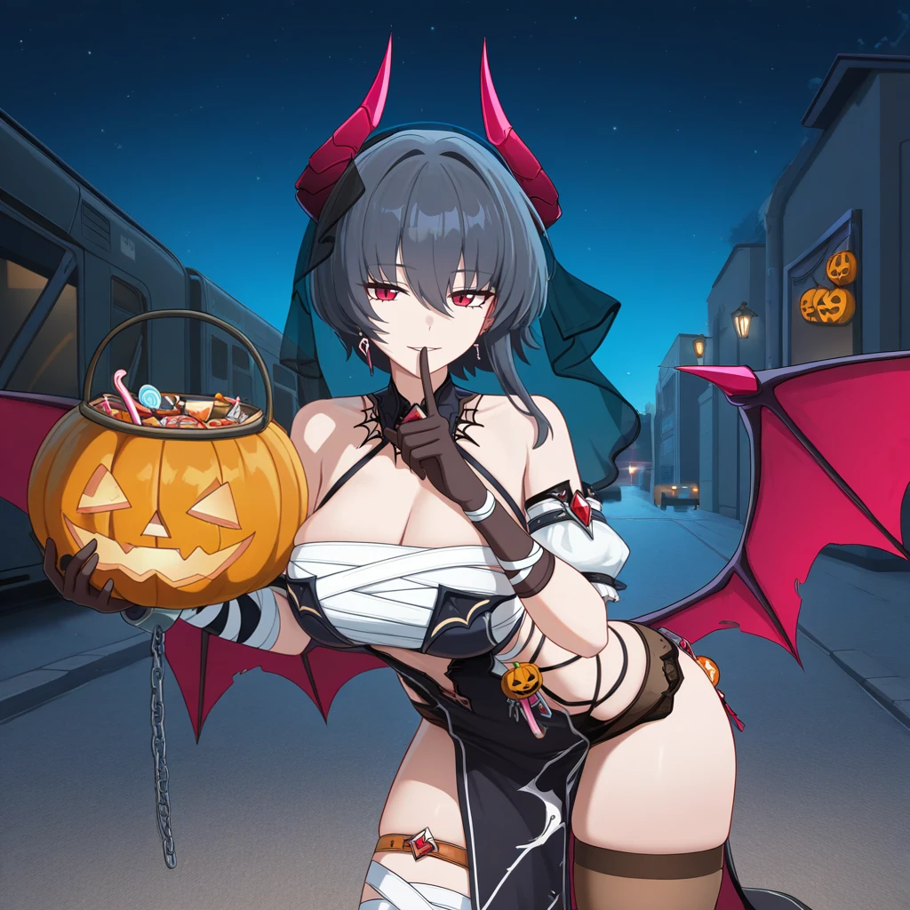 Raven_Spooky, black underwear, single thighhigh, dress, veil, demon wings, halloween costume, horns, bandages, metal cuffs, fingerless gloves, hair ornament, black gloves, Bartender Outfit: