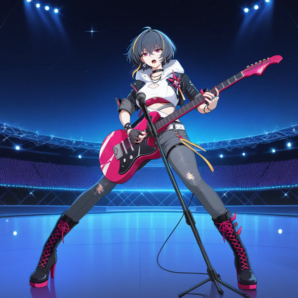 RvnHi3, Fol003, Rv_Idl, streaked hair, multicolored hair, black hair, short hair, purple eyes, ahoge, cropped jacket, hooded jacket, white hood, open jacket, black jacket, belt choker, magenta choker, multiple necklaces, chains, rolled up sleeves, alt cleavage cutout, white crop top, underboob cutout, magenta bra, bra peek, white belt, buckle, leg ribbon, yellow ribbon, grey pants, torn pants, single fingerless glove, alt black glove, multiple rings, white earrings, wrist strap, Optional: "hood up" or "hood down" your choice.