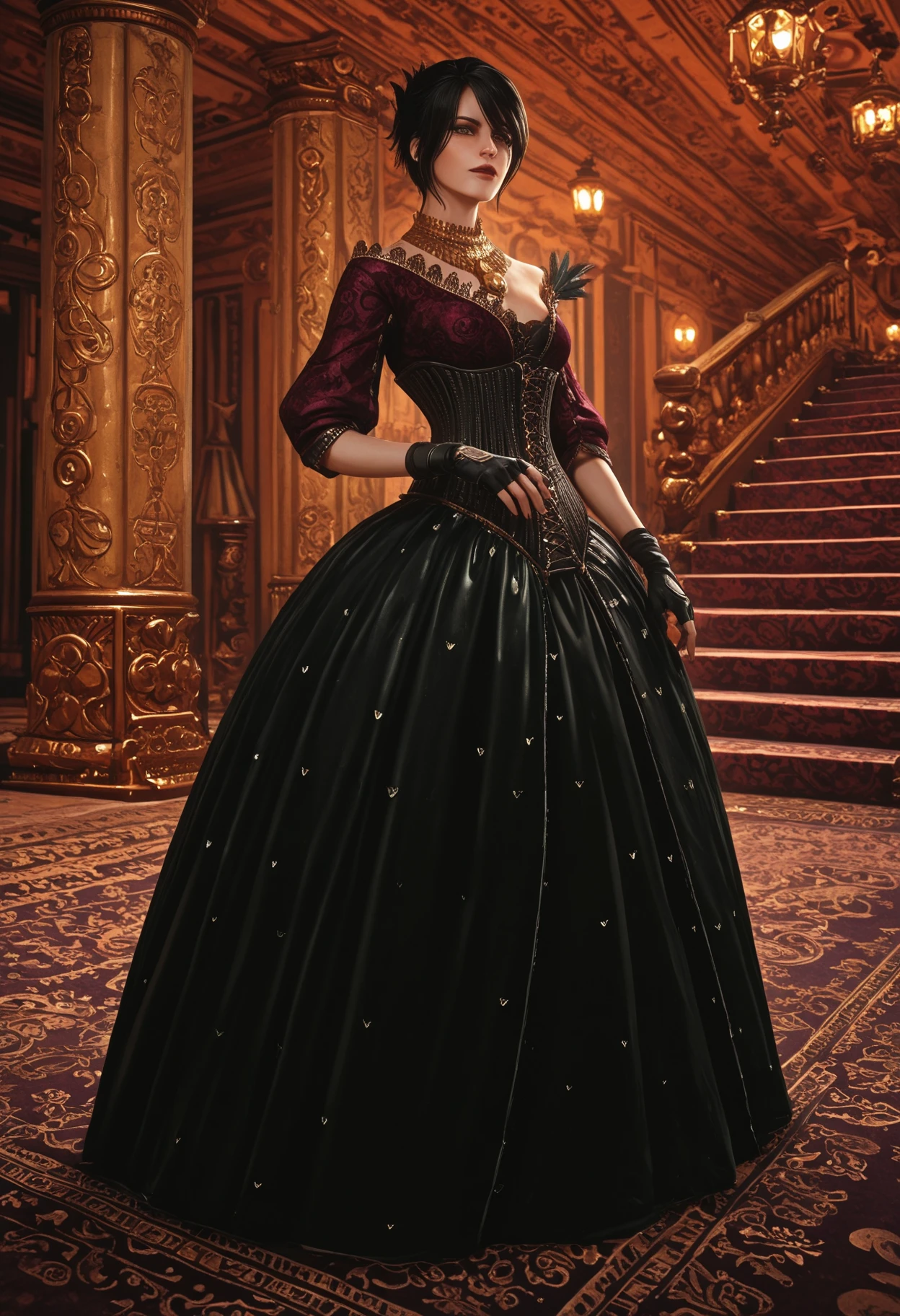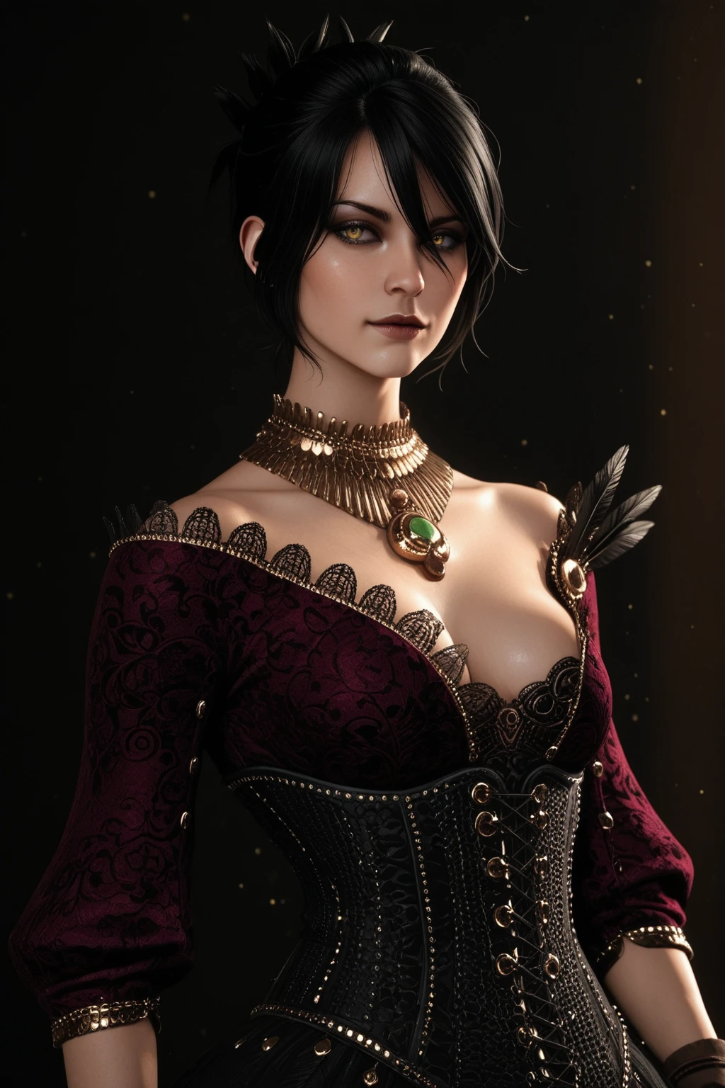 morrigown, gown, strapless dress, patterned dress, usekh collar, green gem, feather, brooch, corset, studs, criss-cross strings, fingerless gloves,Morrigan