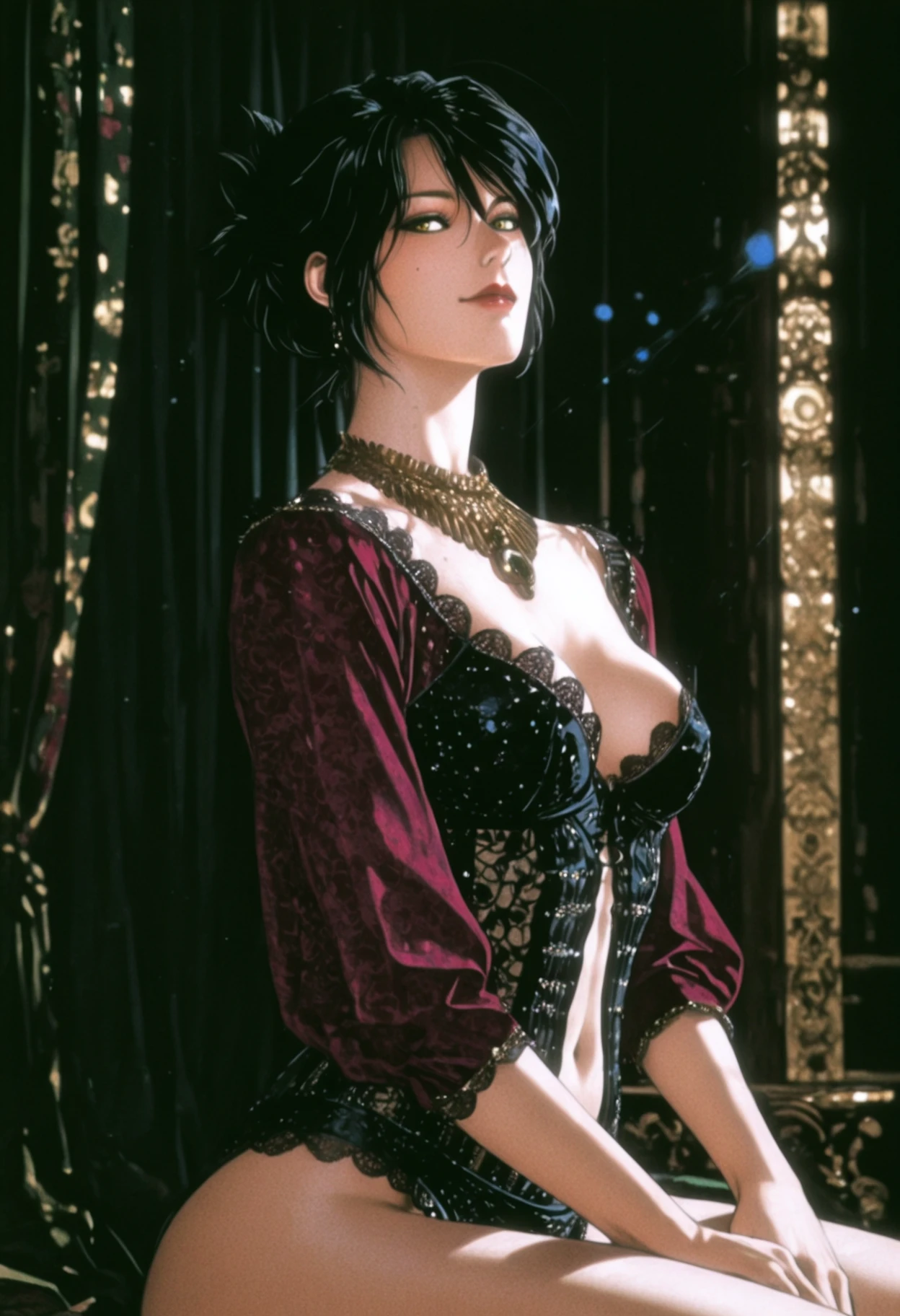 yellow eyes, short hair, black hair, updo, lips, makeup, lipstick, hair between eyes, mole,Negative