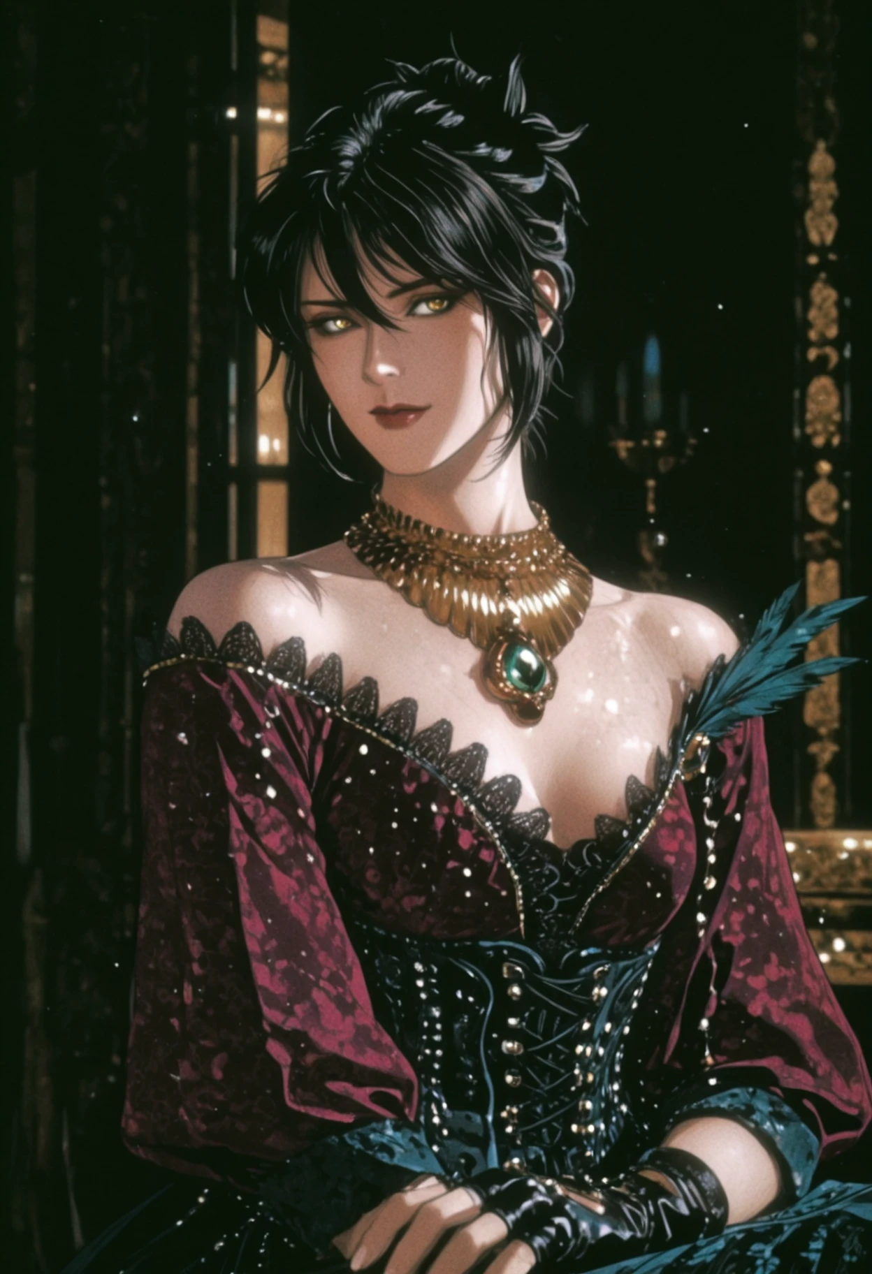 gown, strapless dress, patterned dress, usekh collar, green gem, feather, brooch, corset, studs, criss-cross strings, fingerless gloves,