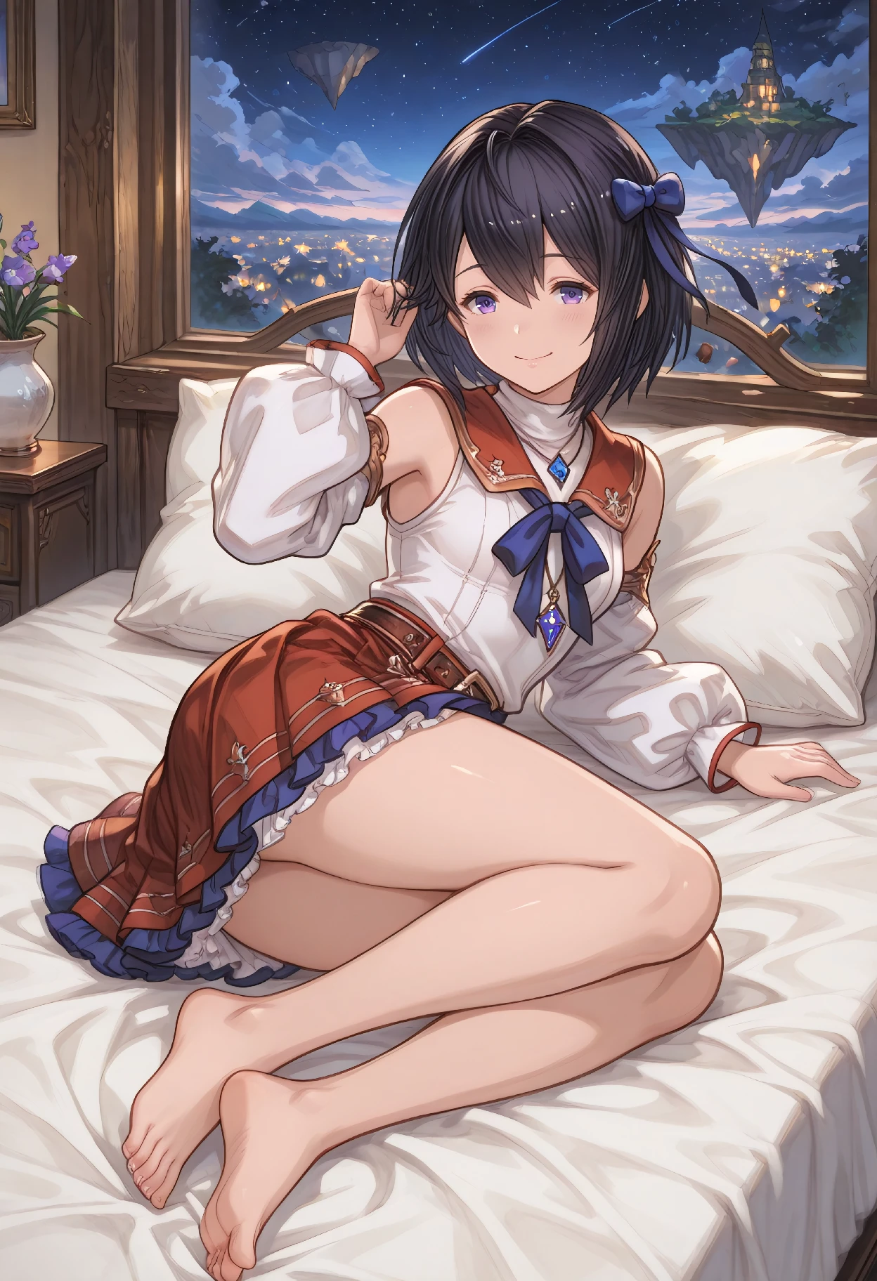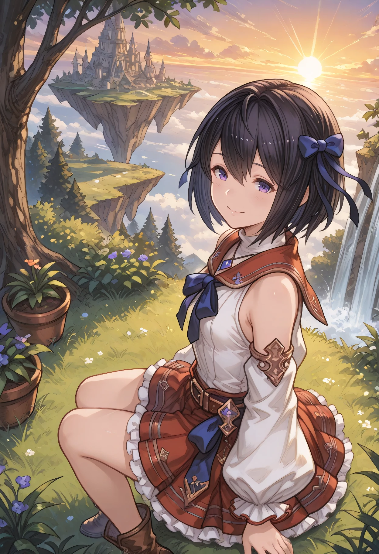 SalriaCasual (Granblue Fantasy), black hair, short hair, hair between eyes, purple eyes, hair ornament, hair ribbon, hair bow, blue ribbon, blue bow, jewelry, necklace, pendant, sailor collar, turtleneck, white shirt, sleeveless, shoulders, puffy sleeves, puffy long sleeves, detached sleeves, belt, red skirt, miniskirt, pleated skirt, frilled skirt, frills, petticoat, brown footwear, ankle boots,