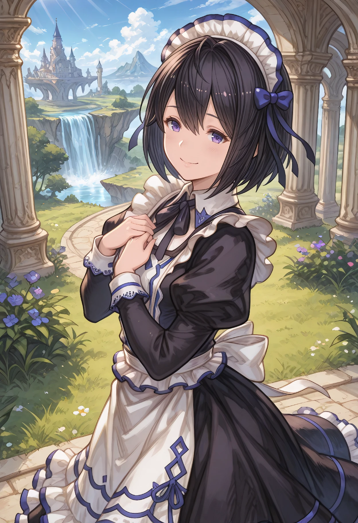 SalriaBase (Granblue Fantasy), black hair, short hair, bob cut, hair between eyes, purple eyes, maid headdress, hair bow, neck ribbon, blue ribbon, black dress, juliet sleeves, frills, maid apron, white apron,