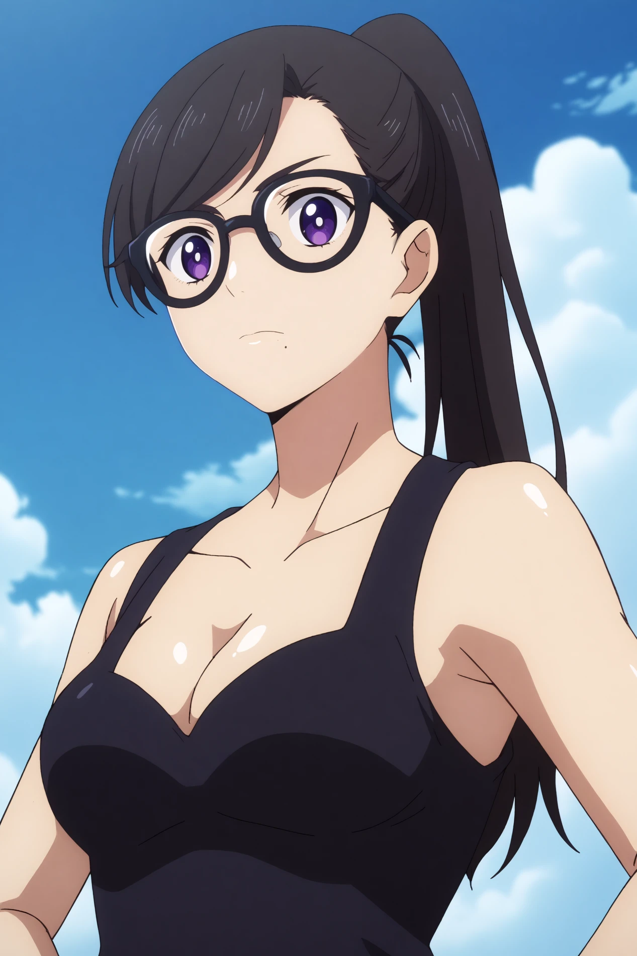 Triggers : hizuru minakata,1girl,solo,glasses,breasts,cleavage, gloves, ponytail, mole under mouth,long_hair, looking at viewer,black-framed eyewear,bangs