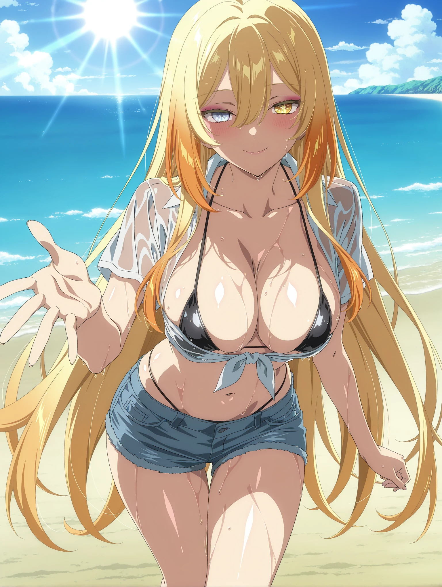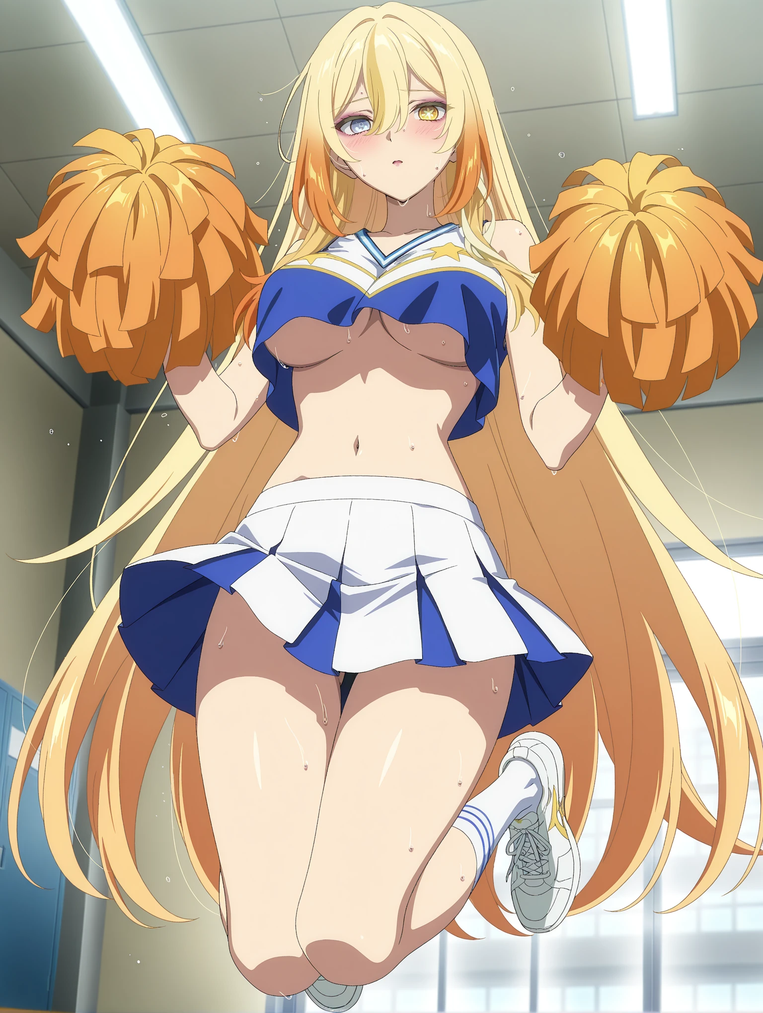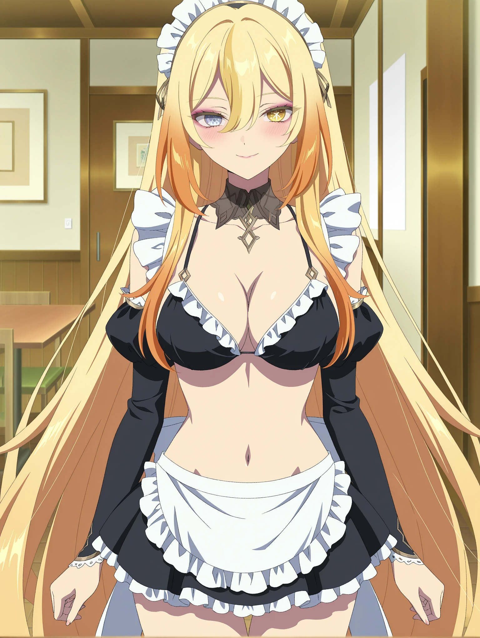 Basic: rhinedottir (character), 1girl, blue eyes, heterochromia, yellow eyes, symbol-shaped pupils, blonde hair, multicolored hair, orange hair, hair between eyes, very long hair, makeup