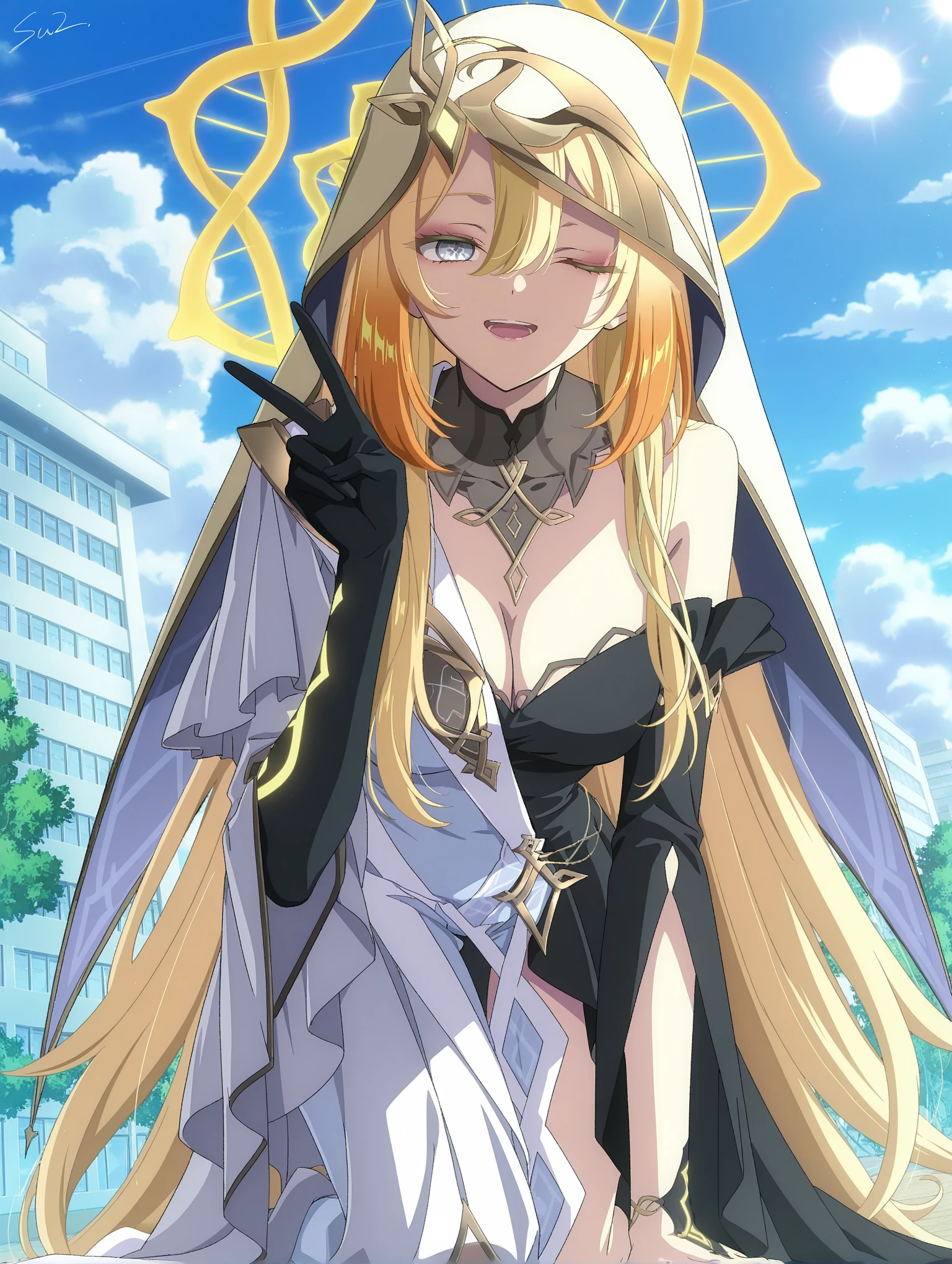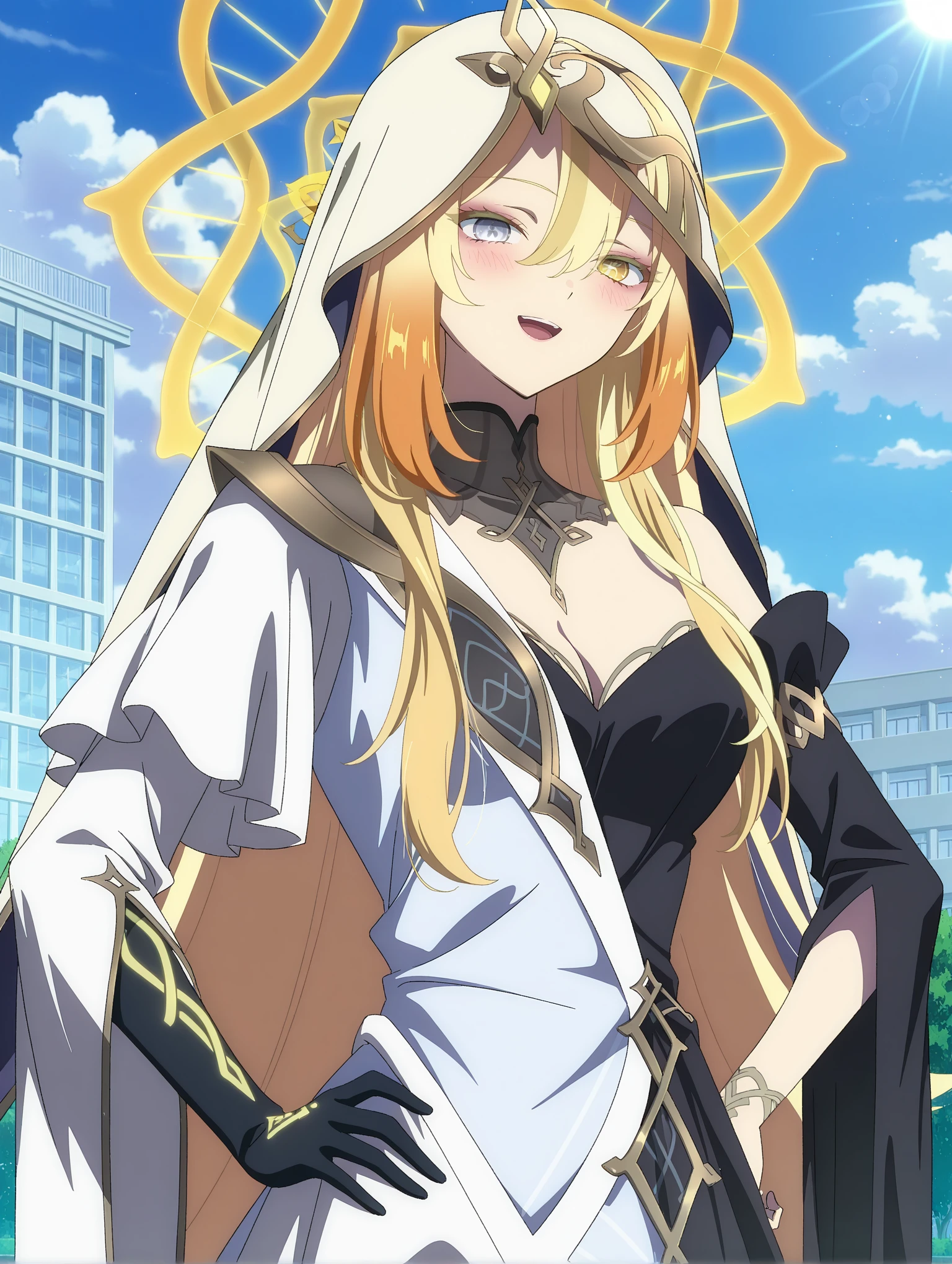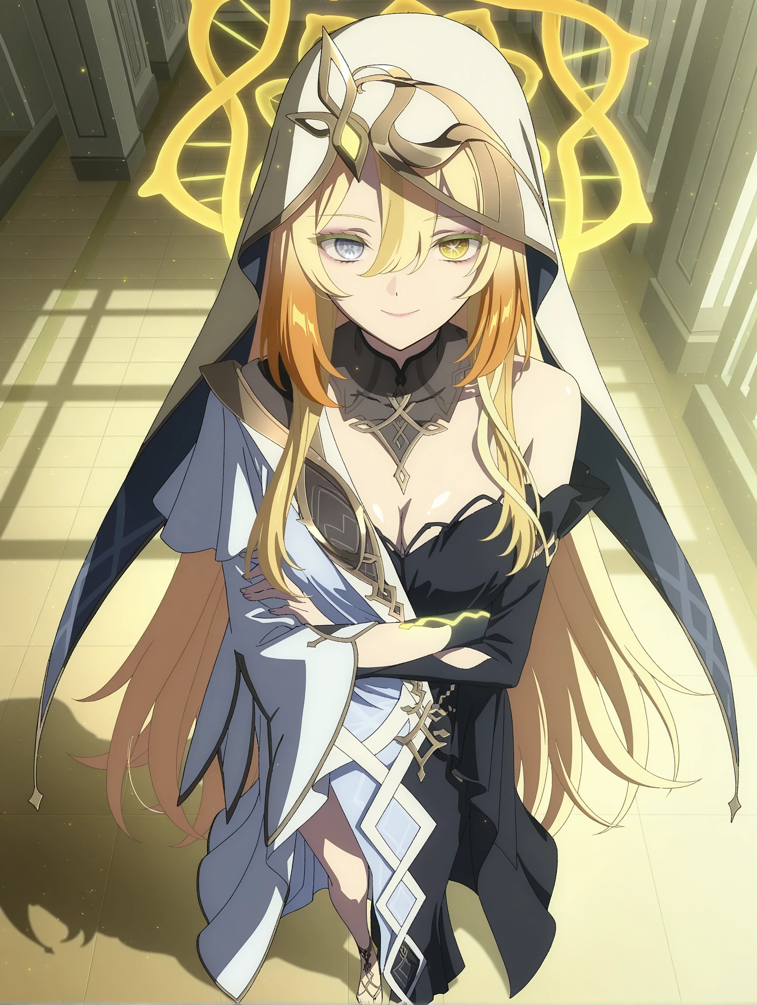 Outfit: rhinedottir (character), def (outfit), 1girl, blue eyes, heterochromia, yellow eyes, symbol-shaped pupils, blonde hair, multicolored hair, orange hair, hair between eyes, very long hair, makeup, veil, long veil, detached collar, dress, white dress, asymmetrical dress, two-tone dress, black dress, cleavage, wide sleeve, black glove, single elbow glove, single bare shoulder, asymmetrical sleeves, single sleeve, single detached sleeve, armband, long dress, yellow halo