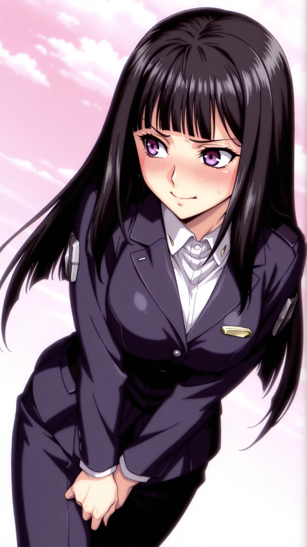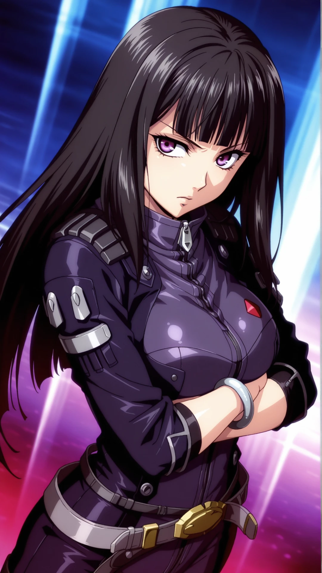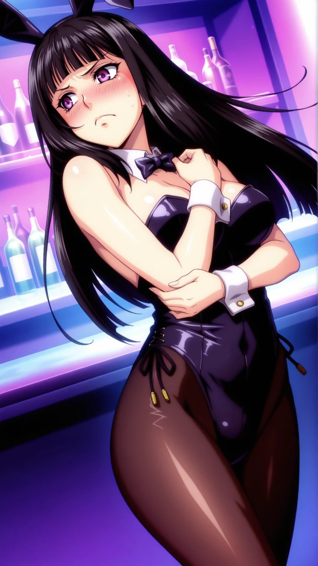 Appearance:black hair, long hair, blunt bangs, purple eyes,