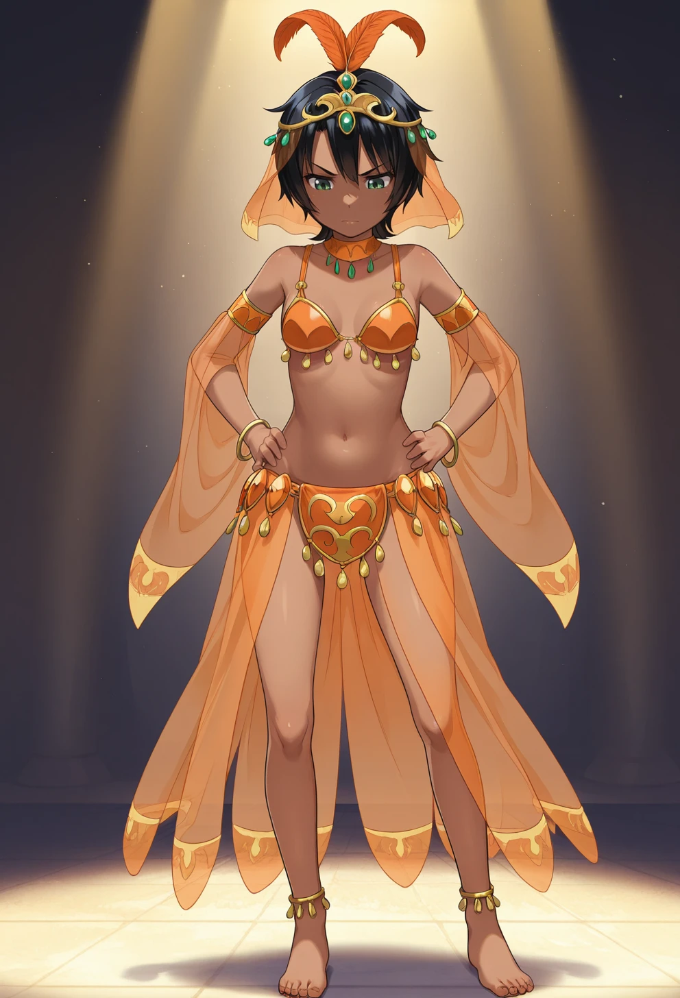 maytadancer, hair ornament, hair feathers ornament, tiara, veil, orange choker, bracelet, jewelry, armlet, see-through sleeves, detached sleeves, gold trim, dancer, harem outfit, arabian clothes, belly dancer, orange bikini, bikini armor, see-through, anklet,Description