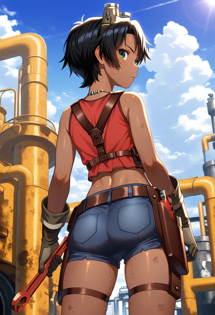 maytacasu, goggles, goggles on head, necklace, red tank top, chest harness, gloves, brown belt, holster, denim shorts, short shorts, brown thigh strap, boots,
