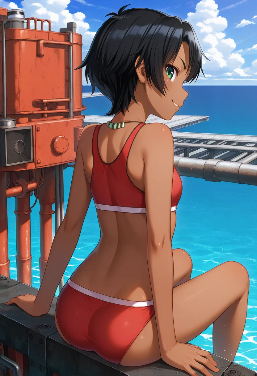 maytacasu, goggles, goggles on head, necklace, red tank top, chest harness, gloves, brown belt, holster, denim shorts, short shorts, brown thigh strap, boots,Bikini :