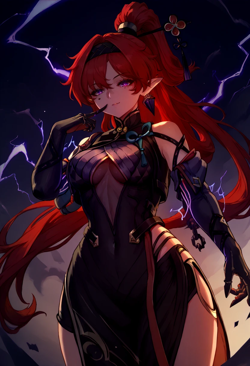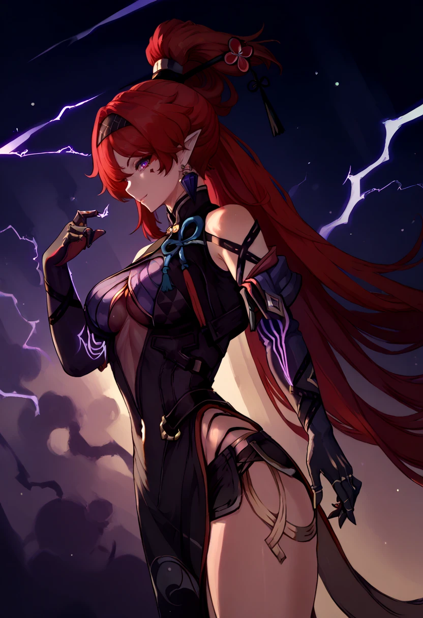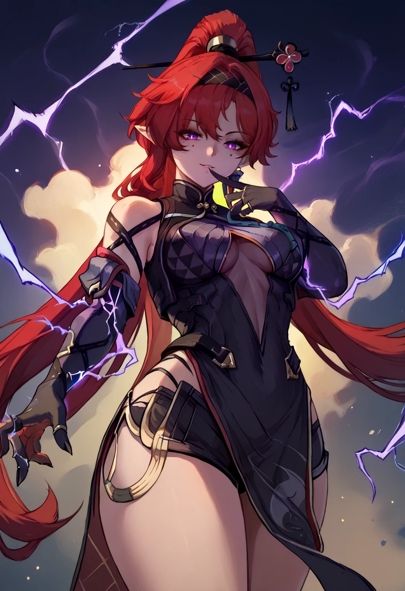 Outfit: ["yinlin_dora, purple eyes, red hair,very long hair, thick hair, hair intakes, single earring, hair pin, high ponytail, folded ponytail, black hairband, pointy ears, circle facial mark, rings, black dress, clothing cutout, pelvic curtain, side slit, black shorts, micro shorts, gloves, elbow gloves, two-tone gloves, glowing, lightningwires, wire, electricity"]