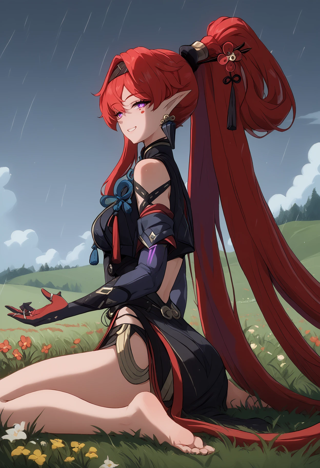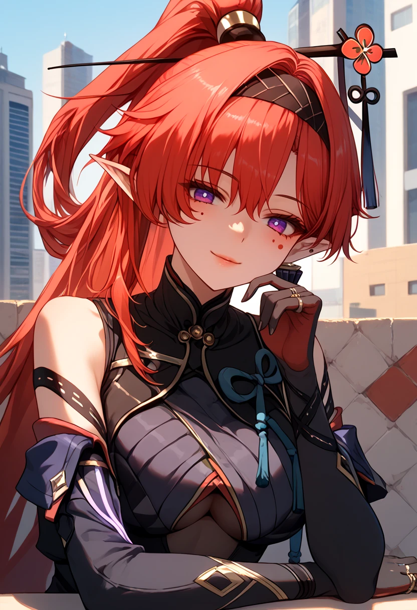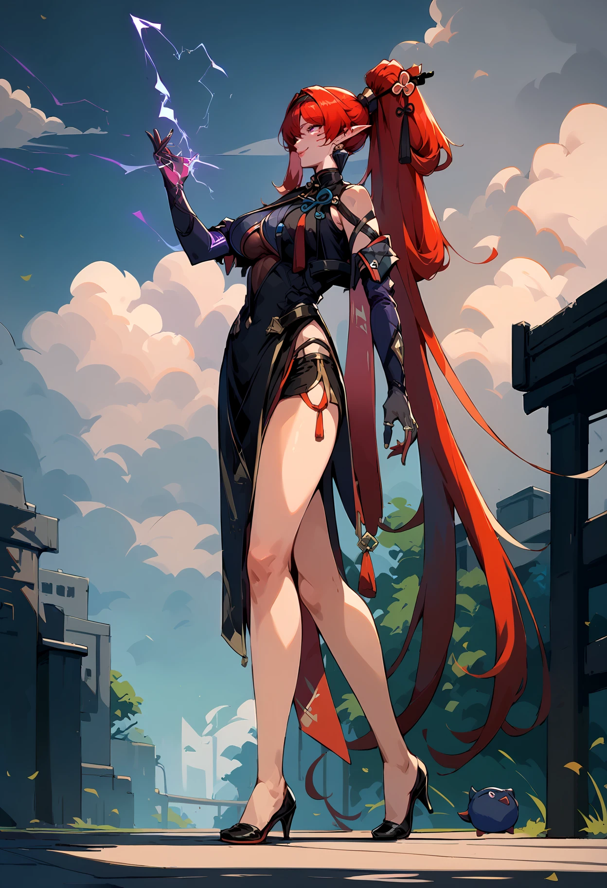 Outfit: ["yinlin_dora, purple eyes, red hair,very long hair, thick hair, hair intakes, single earring, hair pin, high ponytail, folded ponytail, black hairband, pointy ears, circle facial mark, rings, black dress, clothing cutout, pelvic curtain, side slit, black shorts, micro shorts, gloves, elbow gloves, two-tone gloves, glowing, lightningwires, wire, electricity"]
