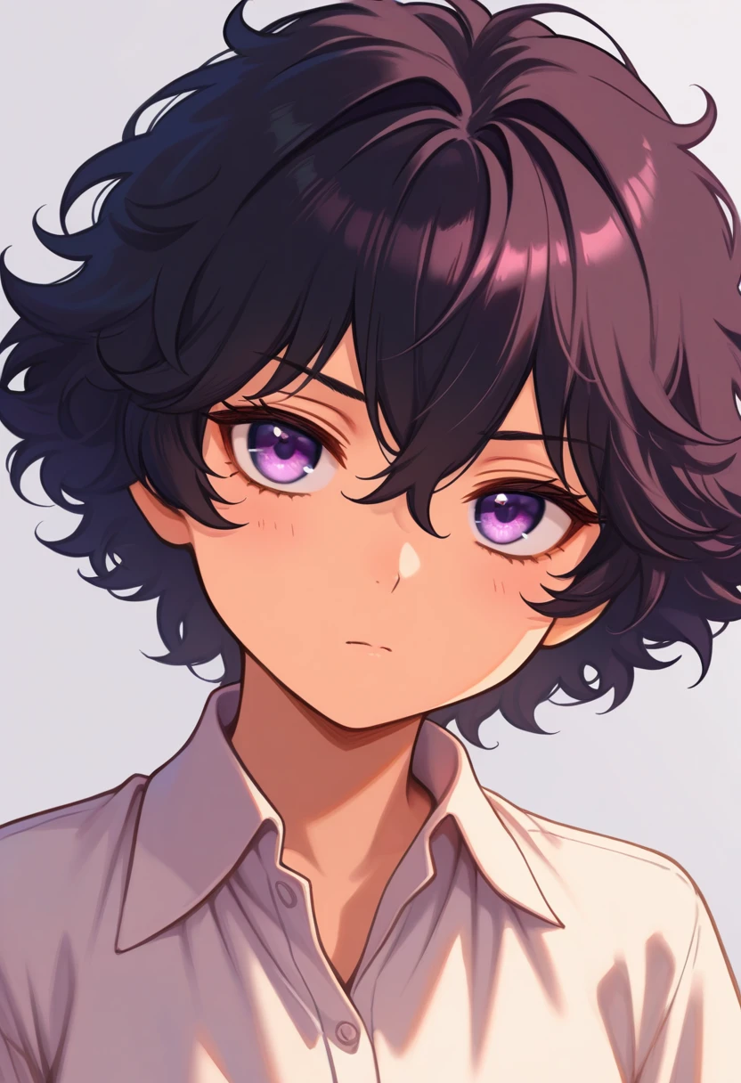 アガット 瑪瑙: 1girl, agott, black eyes, purple eyes, black hair, short hair, hair between eyes, curly hair