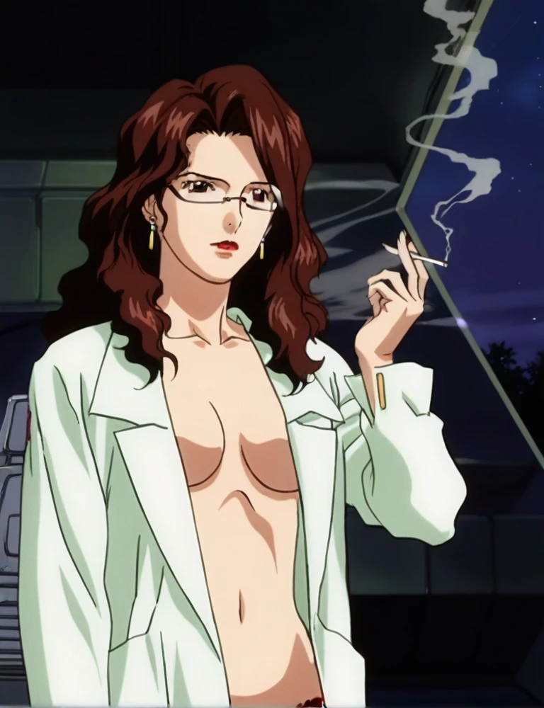 prof, mature_female, age 32, dark_brown_hair, red_eyes(sharp eyes), long_hair, glasses, lipstick, yellow_earrings, mole under left eye, sleepy face, huge breast, plump (curvy, huge ass), Detailed anime style, late 90s and early 2000s animation, strong shading, shadow shaded, warm tones, high contrast, cel-shaded coloring, bold outlines, slightly grainy texture, hand-drawn anime style, VHS effect, vintage anime look, classic anime aesthetic, anime screencap, Anime-style, Evil_smile, smoke, Hold a cigarette,
