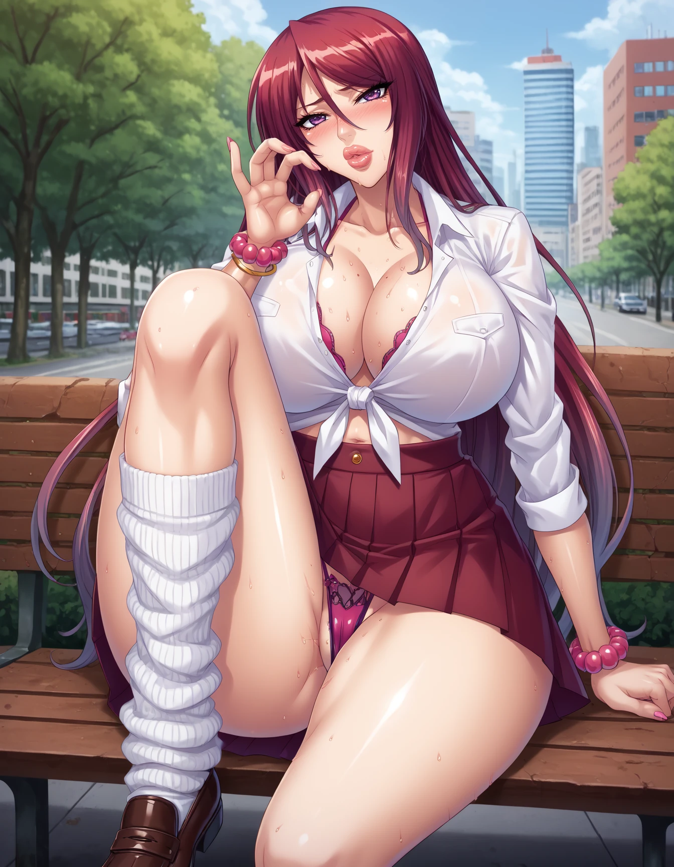Beatrice Kushan, 1girl, mature female, red hair, long hair, purple eyes, huge breasts, red lipsticks, curvy