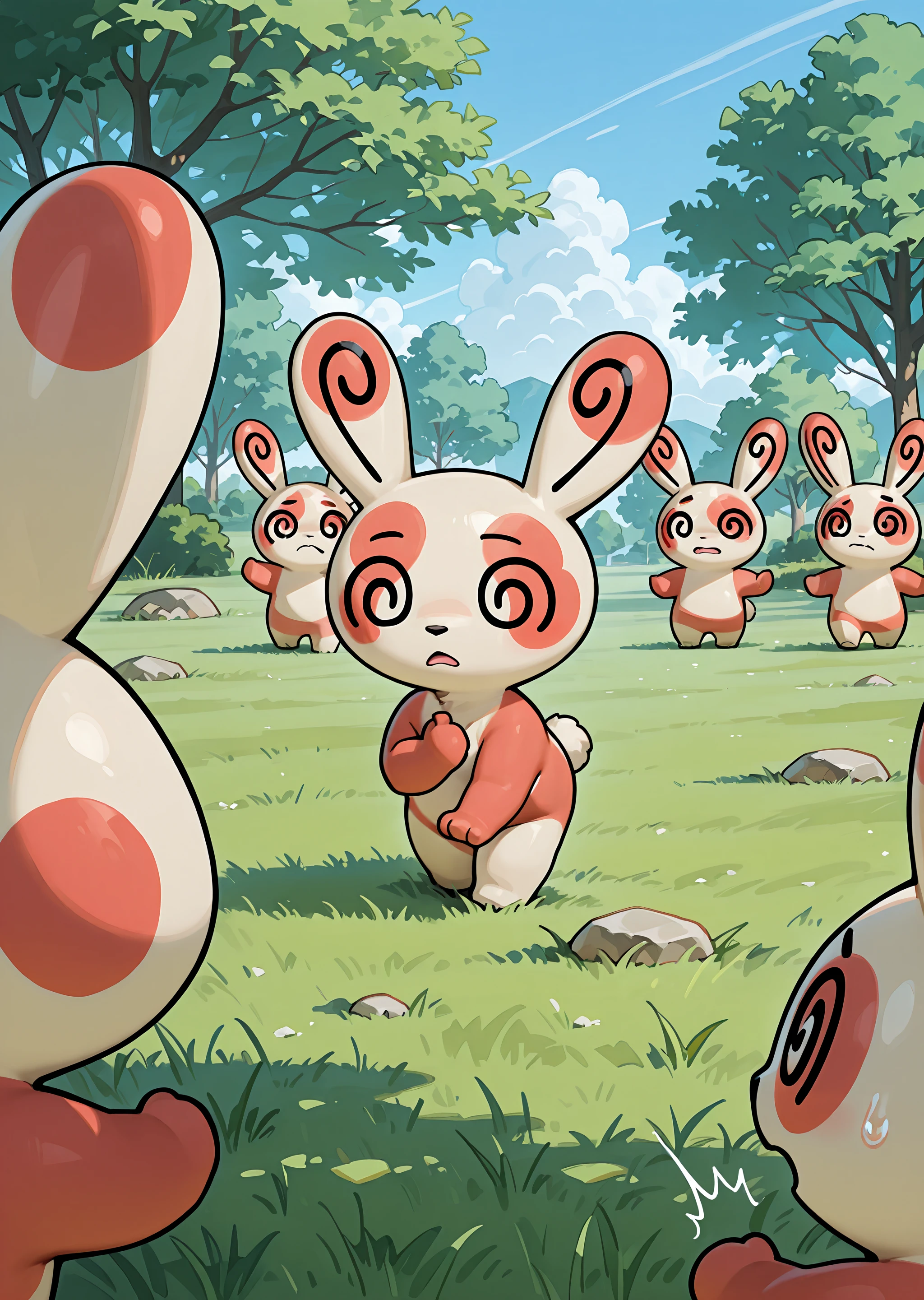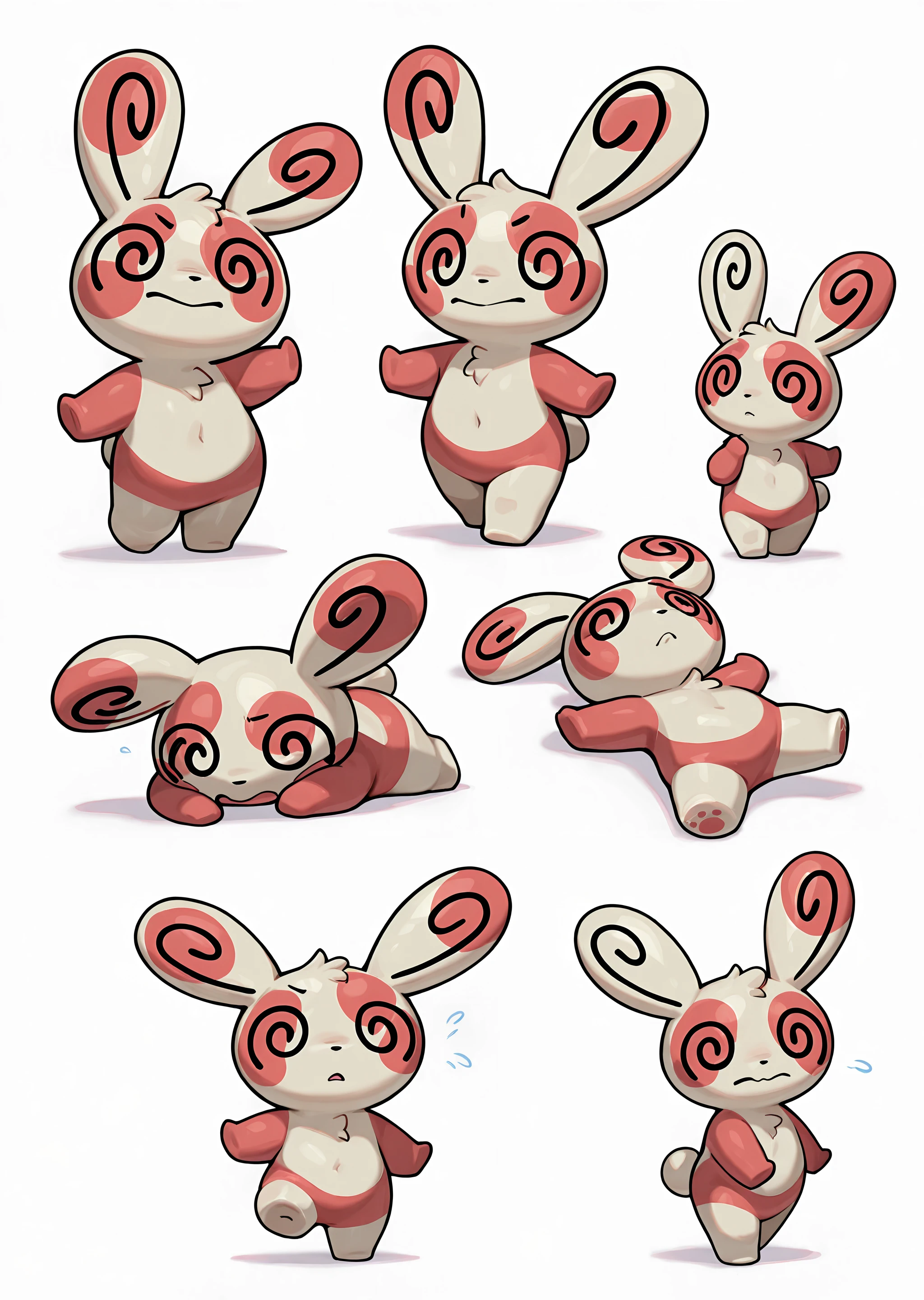 Another one of my favorite pokemon! Couldn't find a Pony LoRA that would give Spindas with just the kind of form I'm after, so took matters to my own hands once again. The swirly eyes seem to be really tough to get dialed in right, sometimes it just takes a few iterations. Seems to default to anime eyes often if prompt requires strong emotion to be shown with eyes.