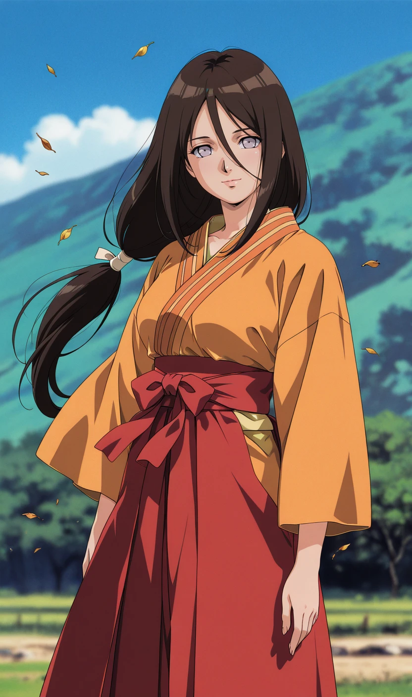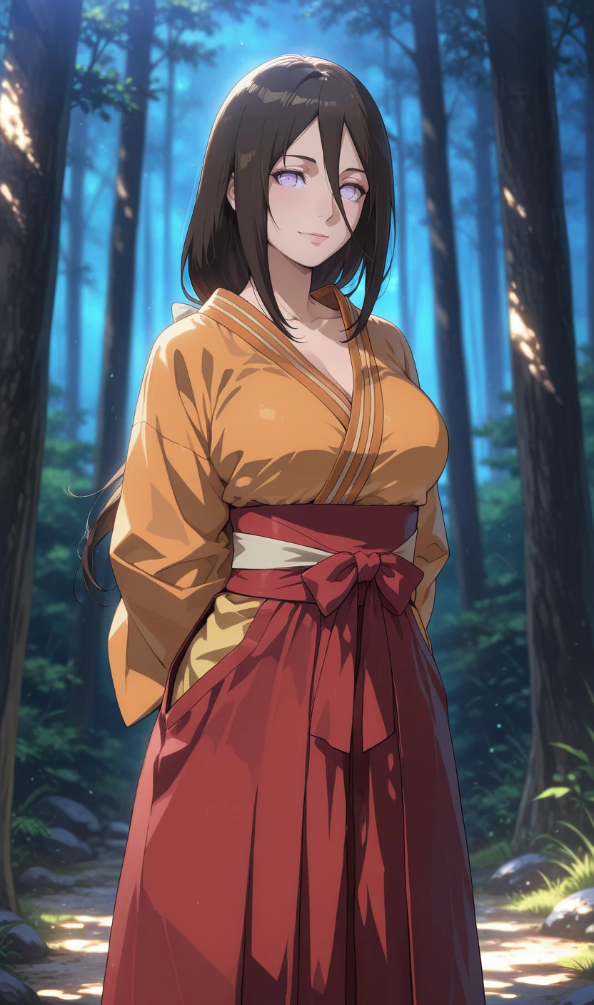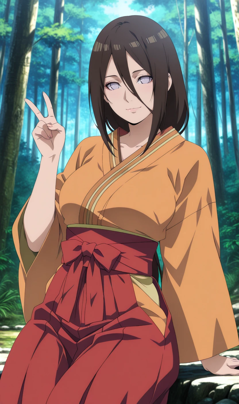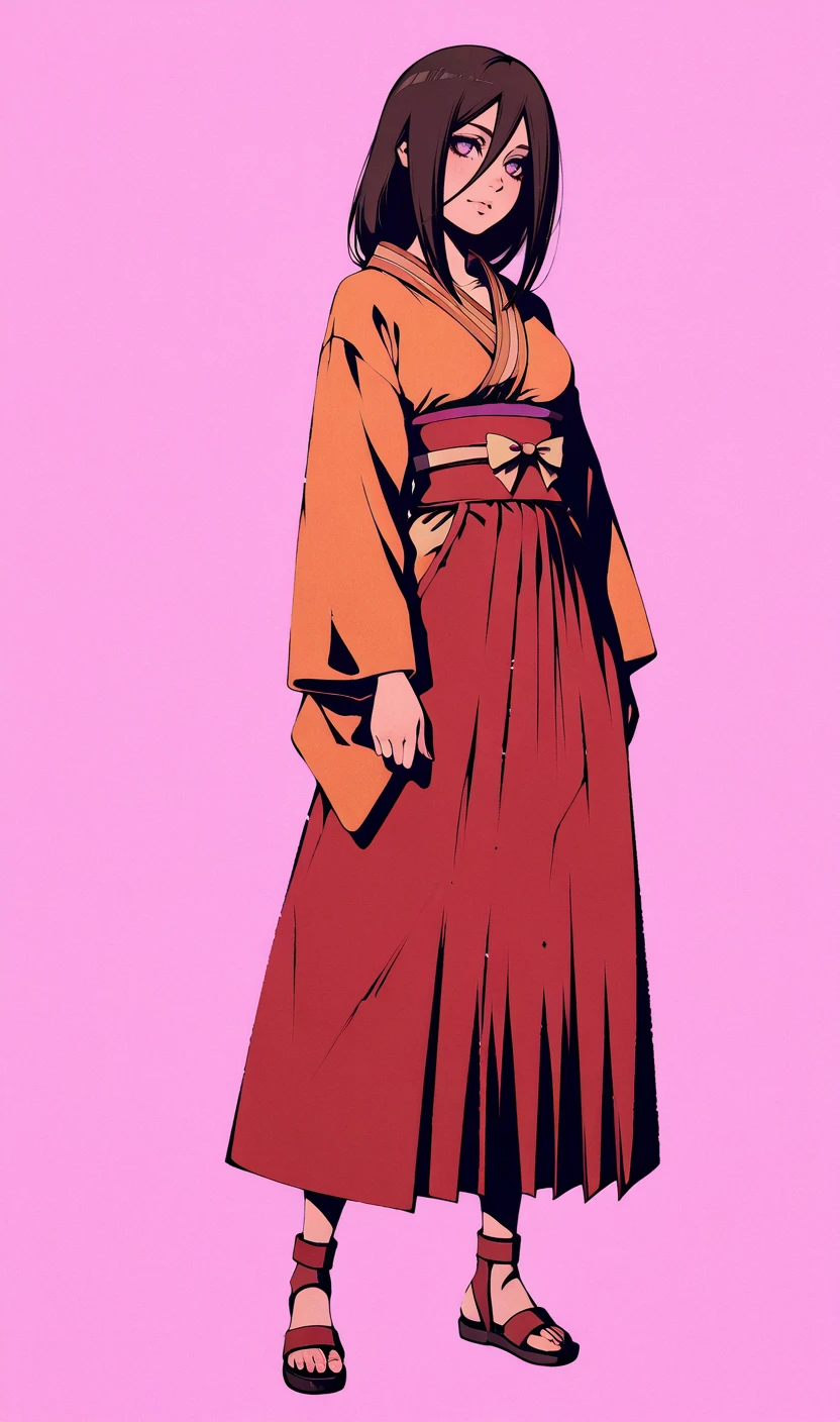 hyuuga hanabi, brown hair, hair between eyes, byakugan, orange kimono, red hakama, sandals