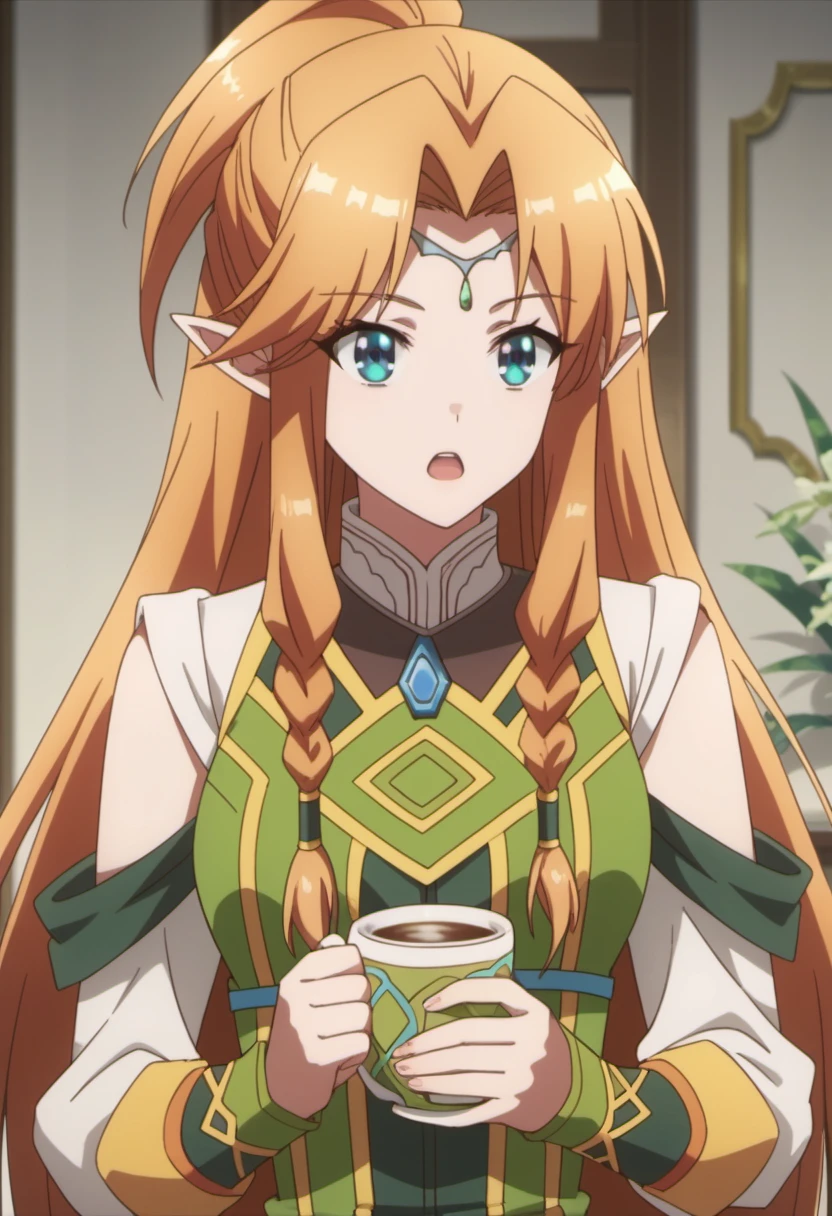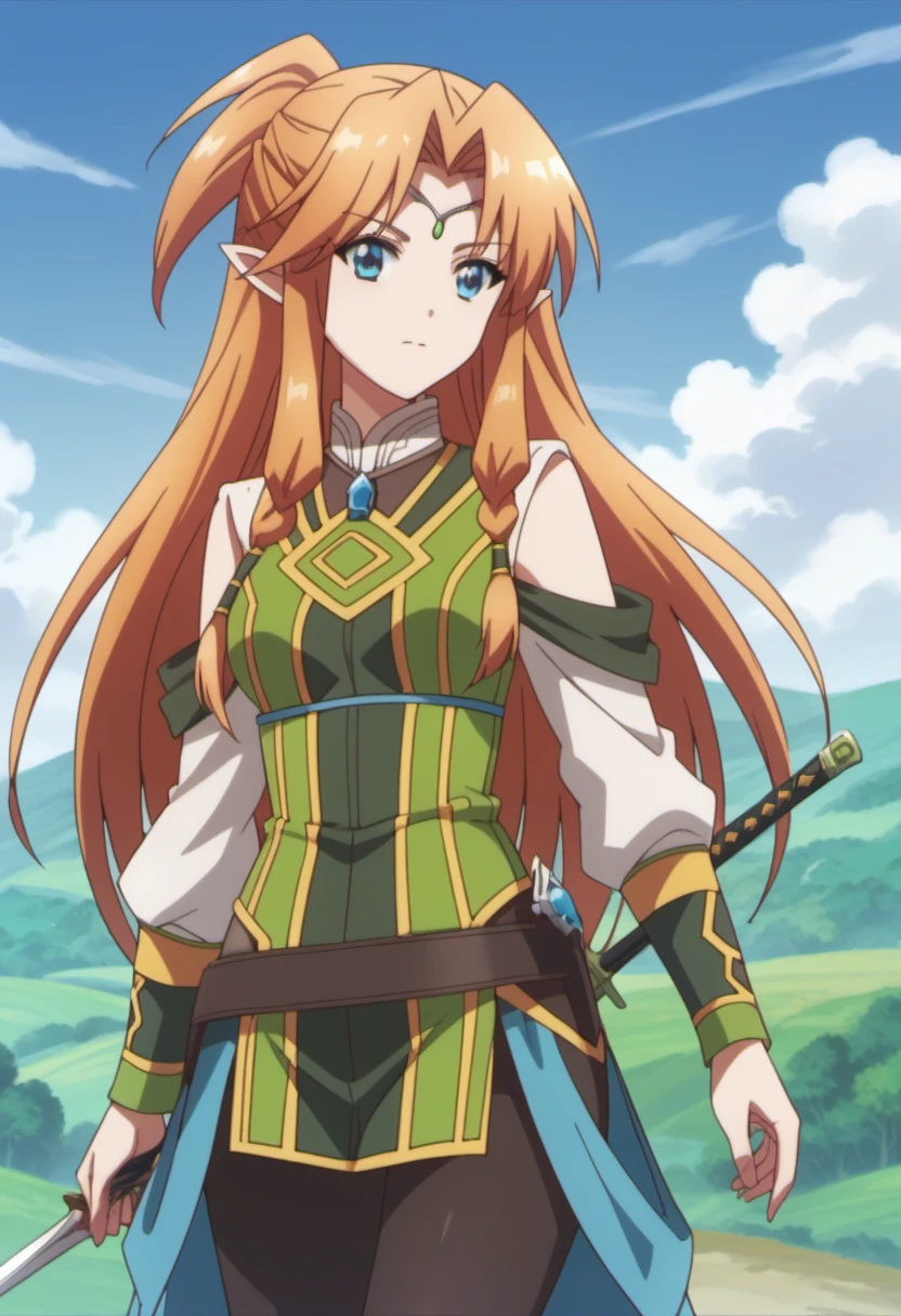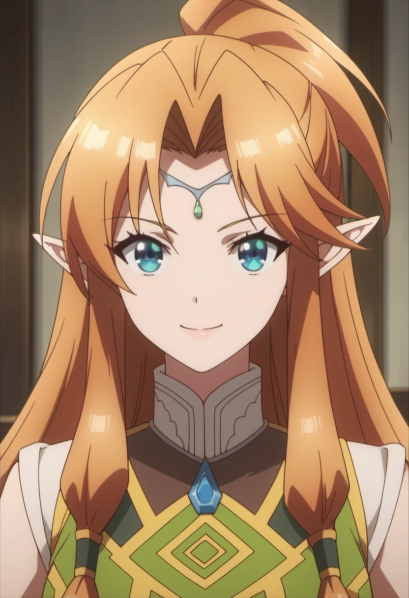 Trigger Words: miyura (isekai cheat magician), long hair, pointy ears, elf, circlet, blue eyes, orange hair