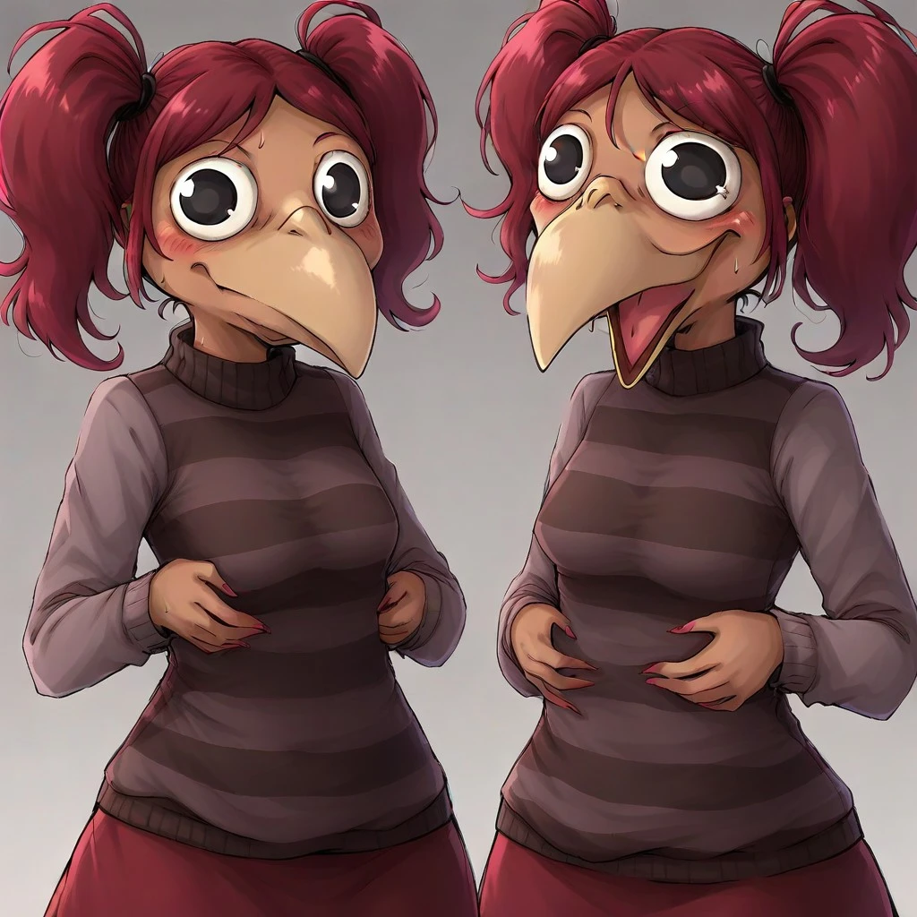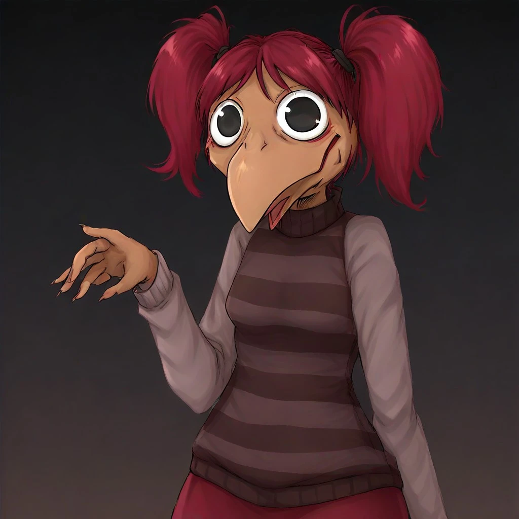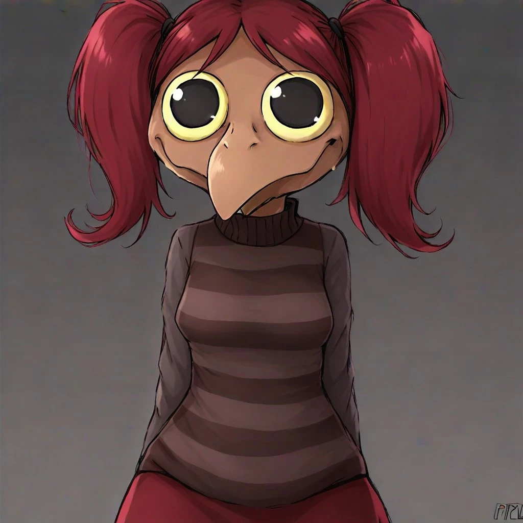 Useful Tags: Toriningen, red hair, beak, red hair,striped shirt,long sleeves,pigtails,red skirt