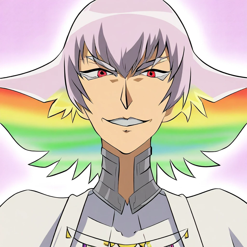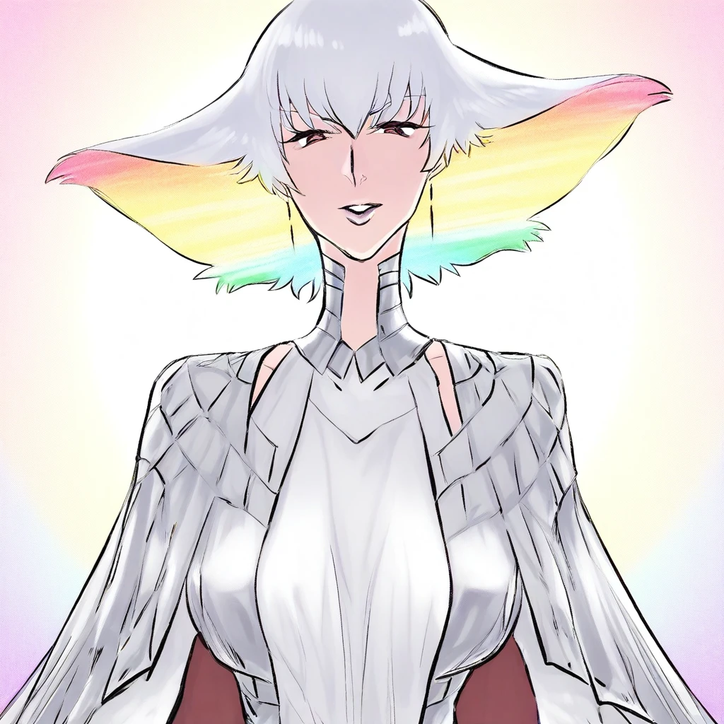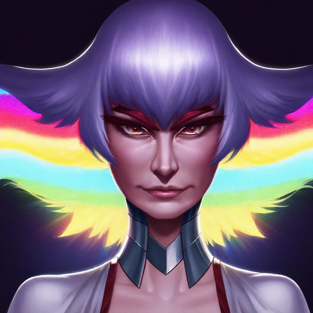 Focused on mature female appearance, sharp facial features, voluminous white hair, and rainbow backlight aesthetic.