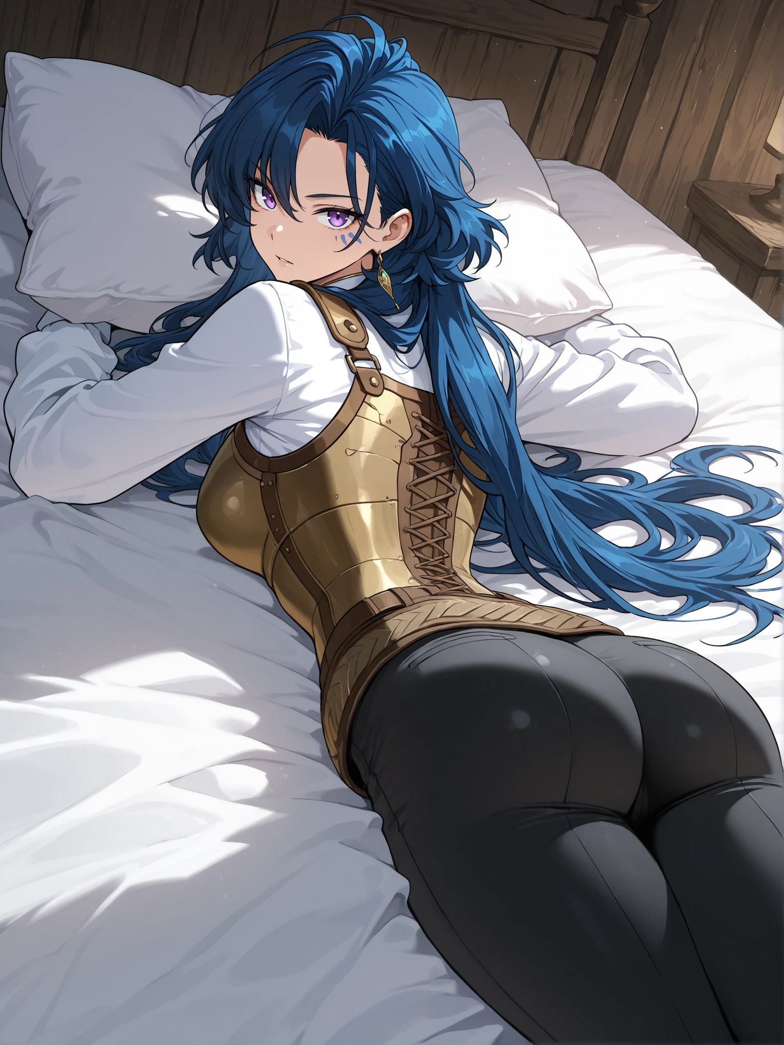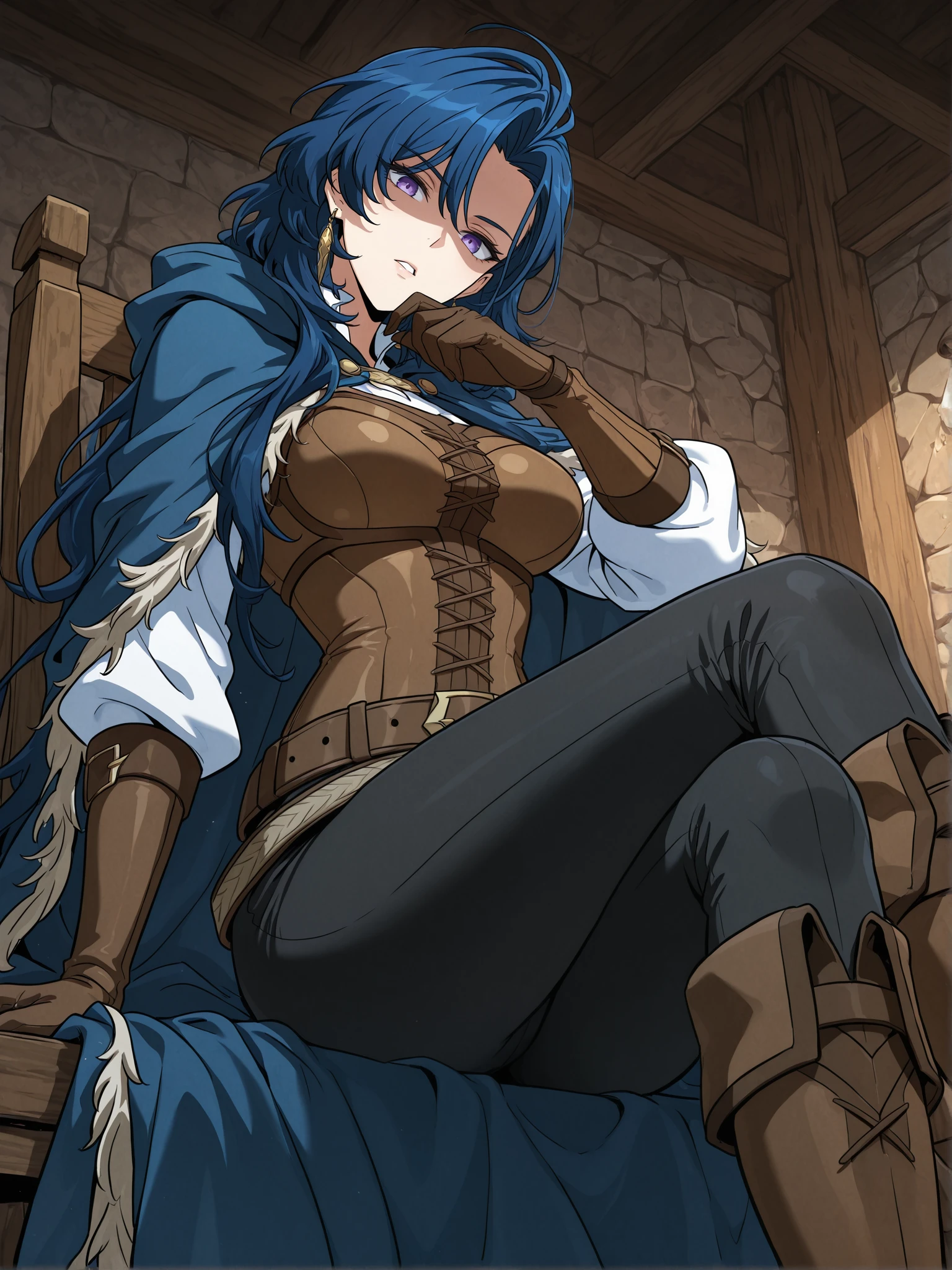 gold earring,blue cloak,white clothes,long sleeves,leather breastplate,long gloves,brown gloves,black pants,brown boots,brown belt,