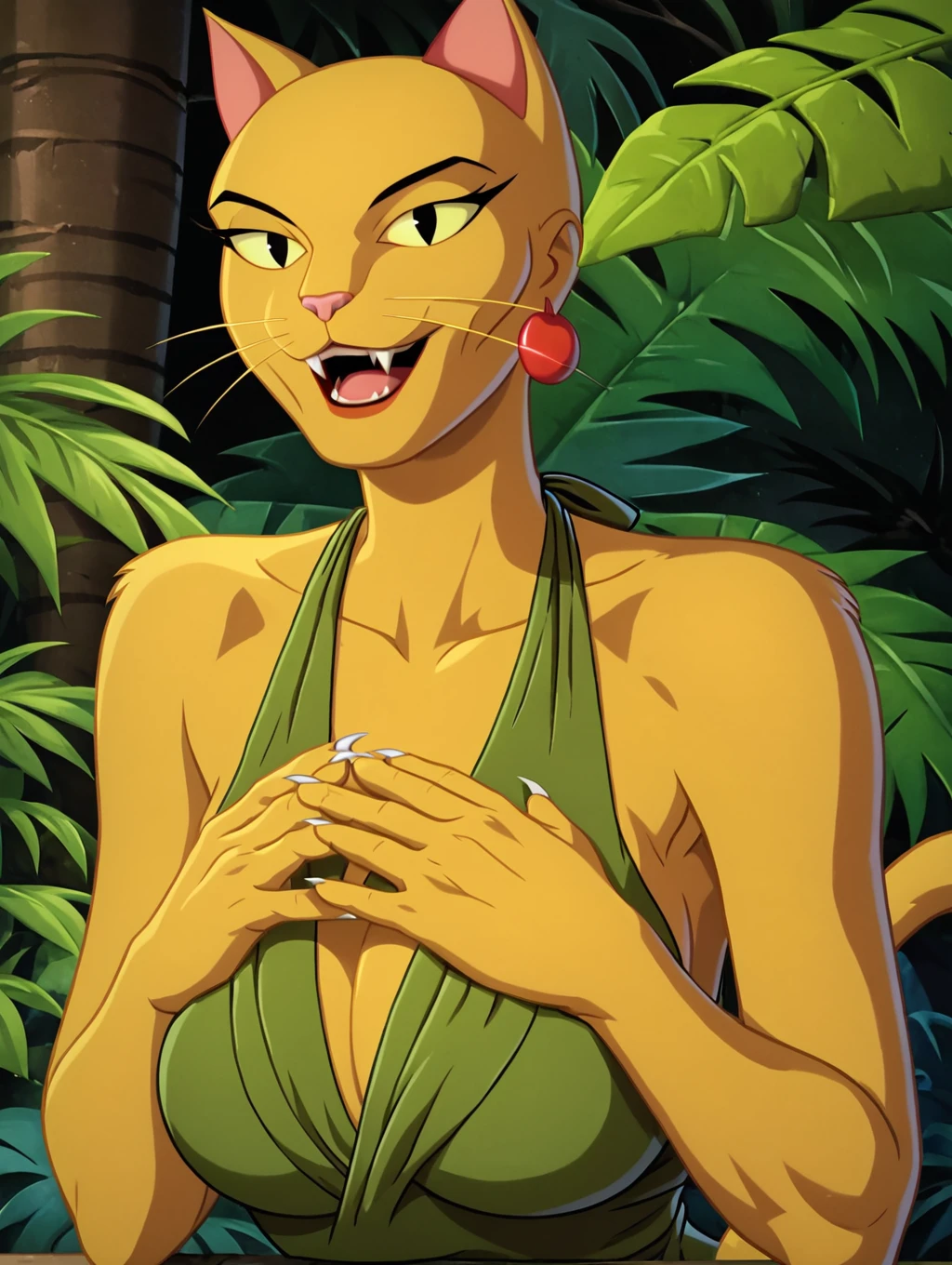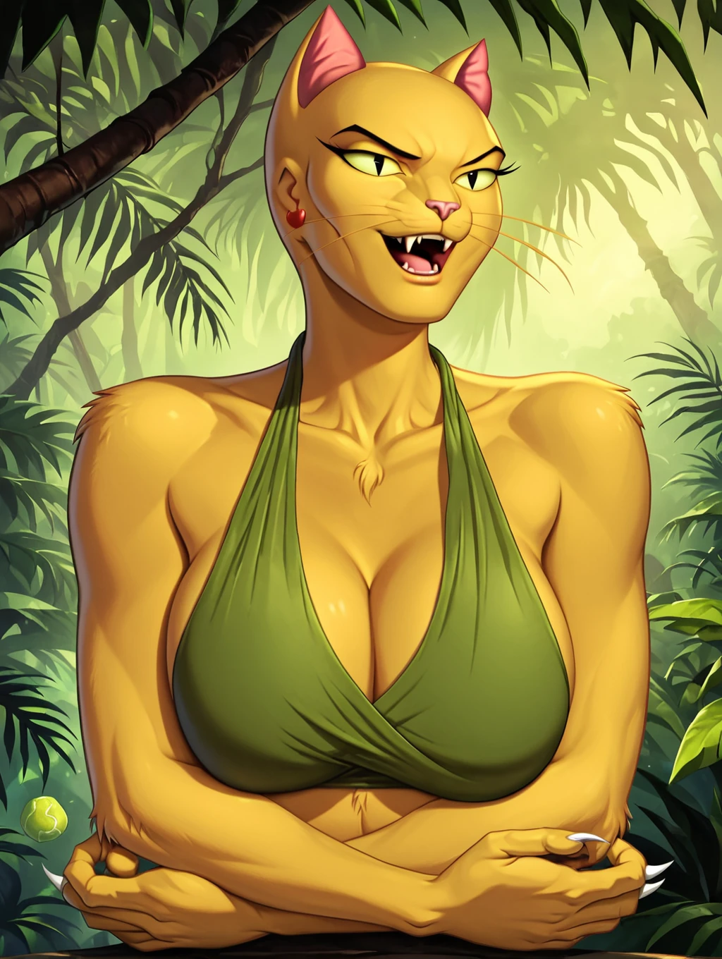 selina, yellow fur,bald,yellow sclera,black eyes,whiskers,cat ears,cat nose, anthro,slit pupils,