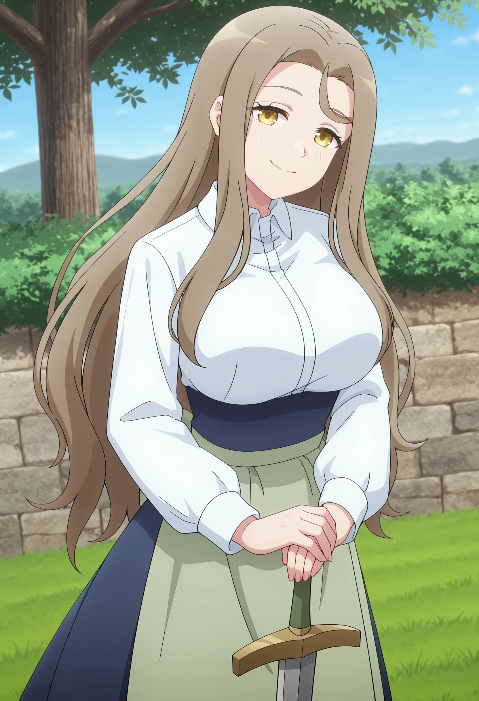 MushokuFarah, yellow eyes, brown hair, long hair, curtained hair, long sidelocks — You can add "mature female" if you want to accentuate those features