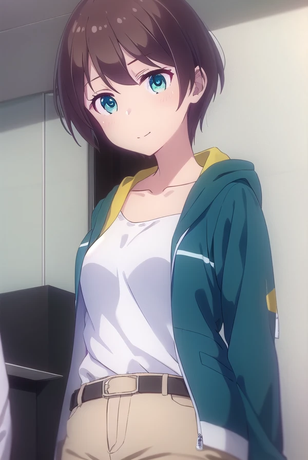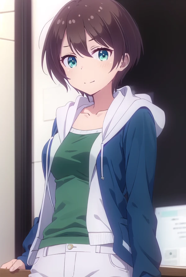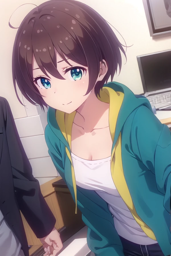 hajime shinoda, short hair, bangs, brown hair, (green eyes:1.3), ahoge,