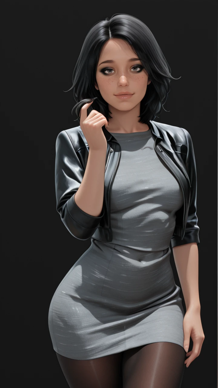 gray dress, black jacket, elbow sleeves, short jacket, short dress, pantyhose