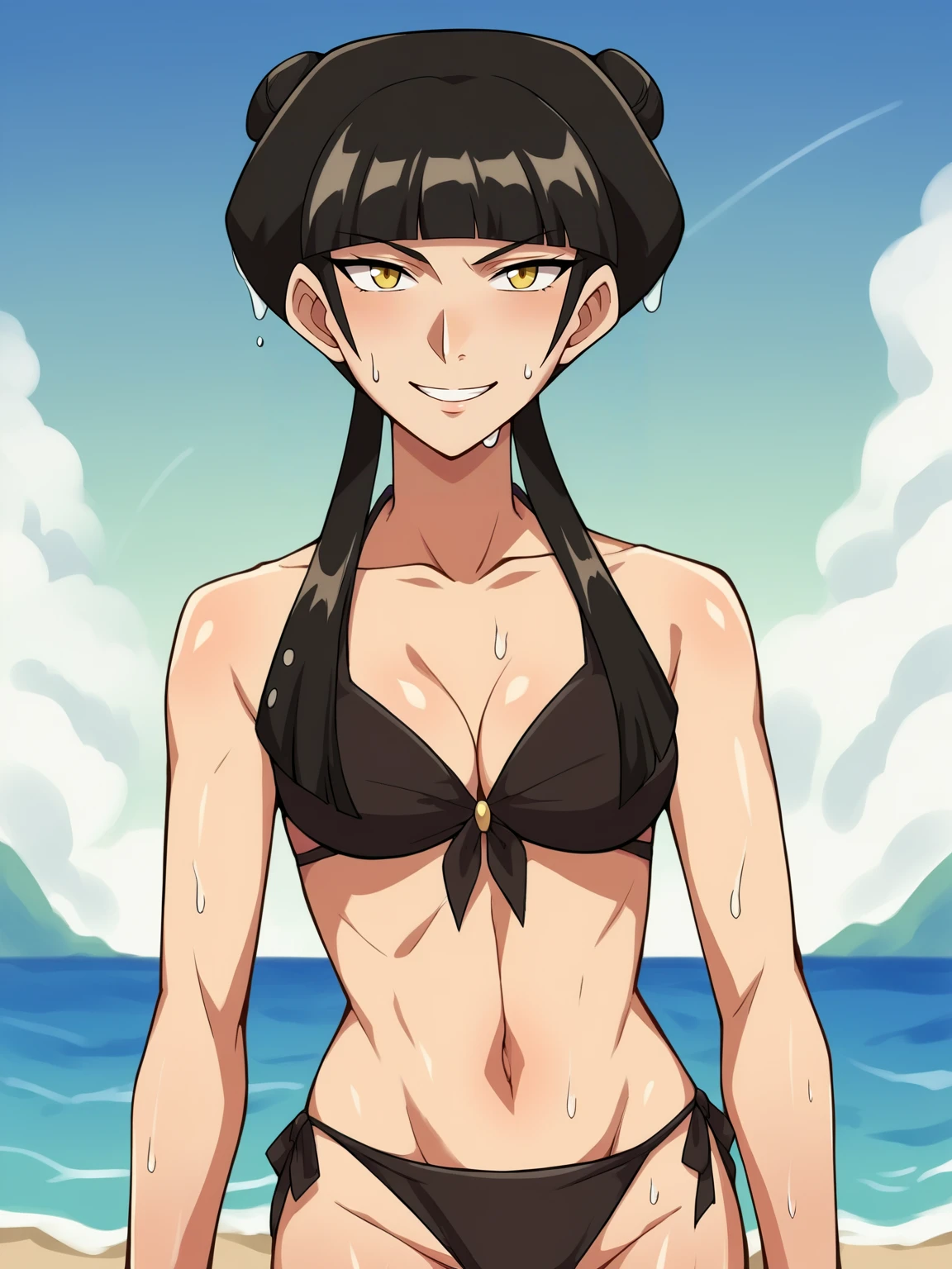 Basic prompts : black hair, long hair, blunt bangs, double hair bun, twintails, sidelocks, yellow eyes