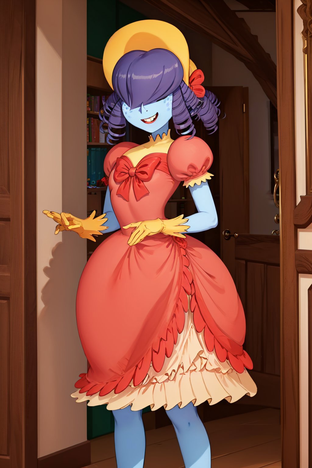 Trigger + Appearance: penny plasm, colored skin, blue skin, drill hair, hair over eyes, ghost tail