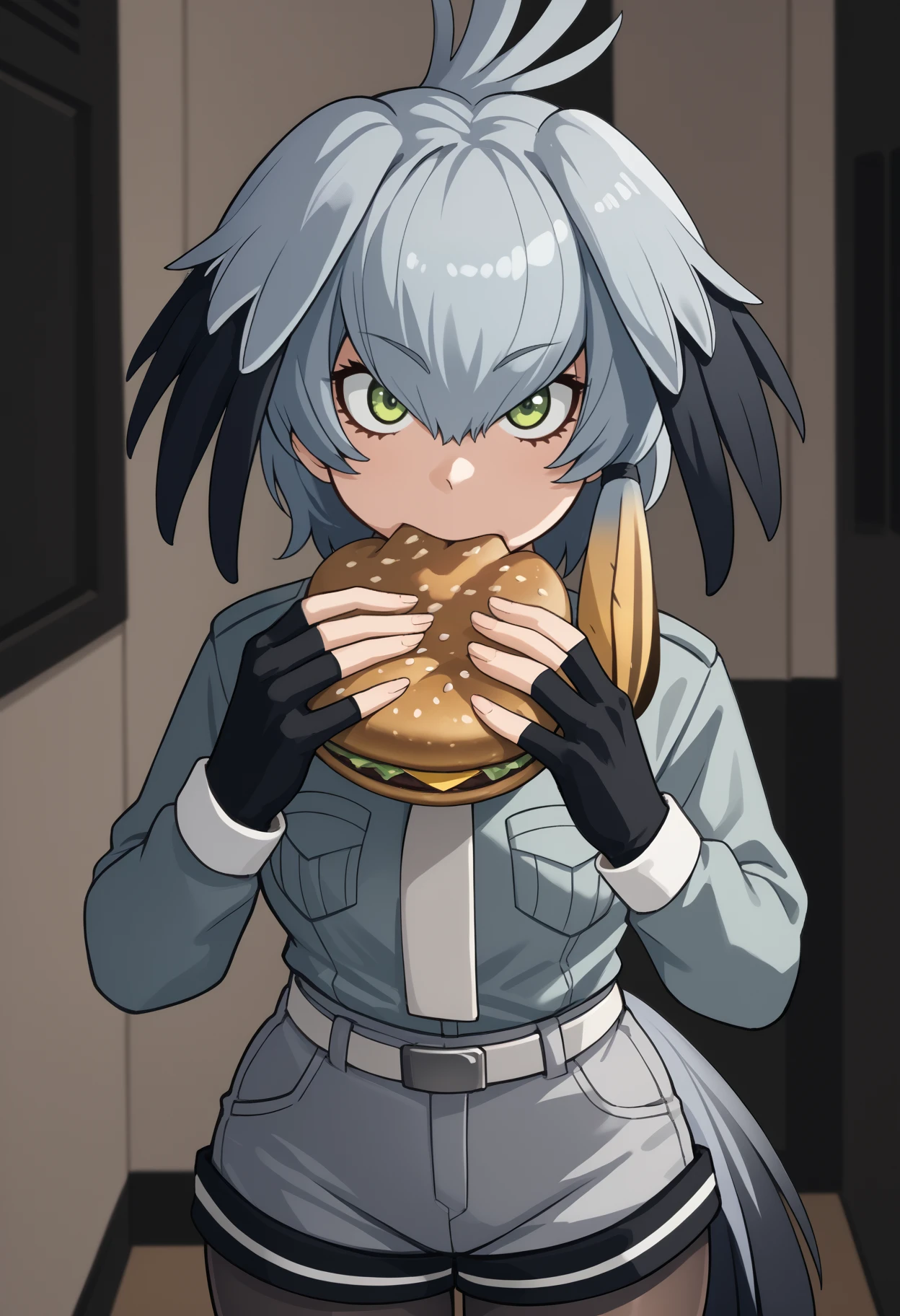 grey shirt, collared shirt, wing collar, white necktie, breast pocket, short over long sleeves, black gloves, fingerless gloves, bodystocking, grey shorts, belt, grey pantyhose
