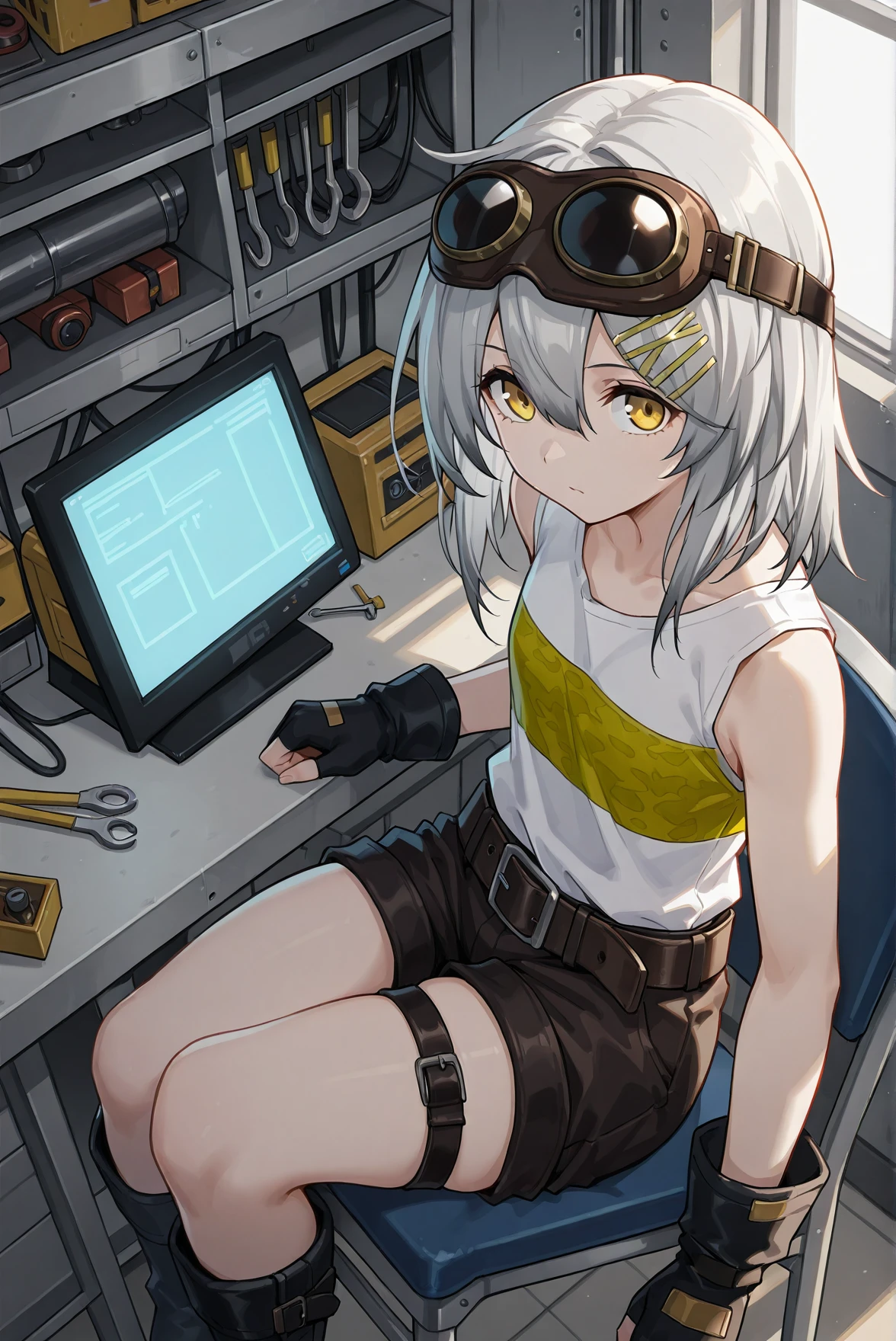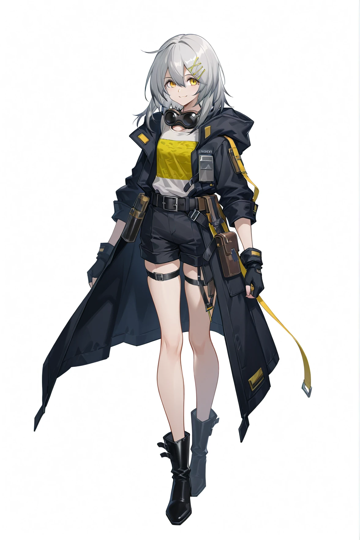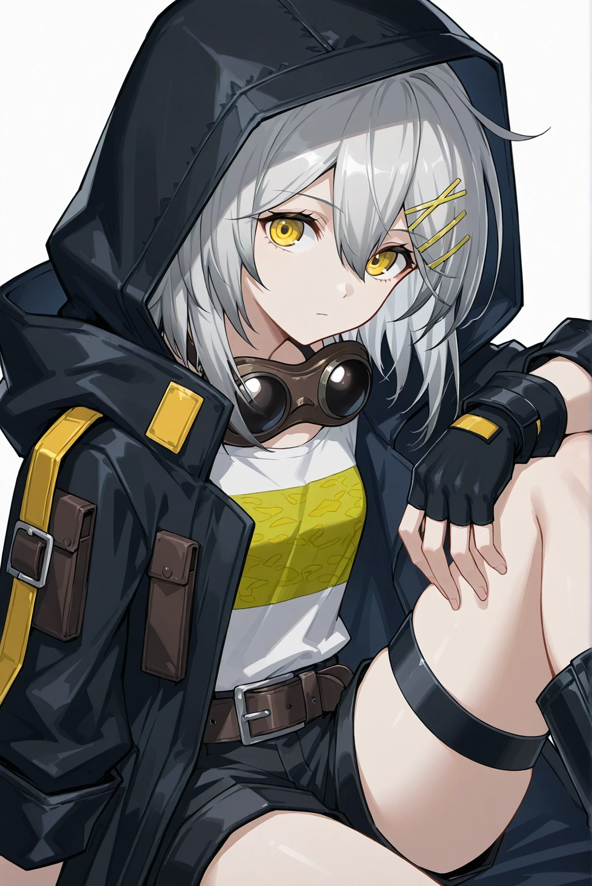 outfit: goggles around neck, hooded coat, shirt, long sleeves, fingerless gloves, belt, shorts, thigh strap, boots