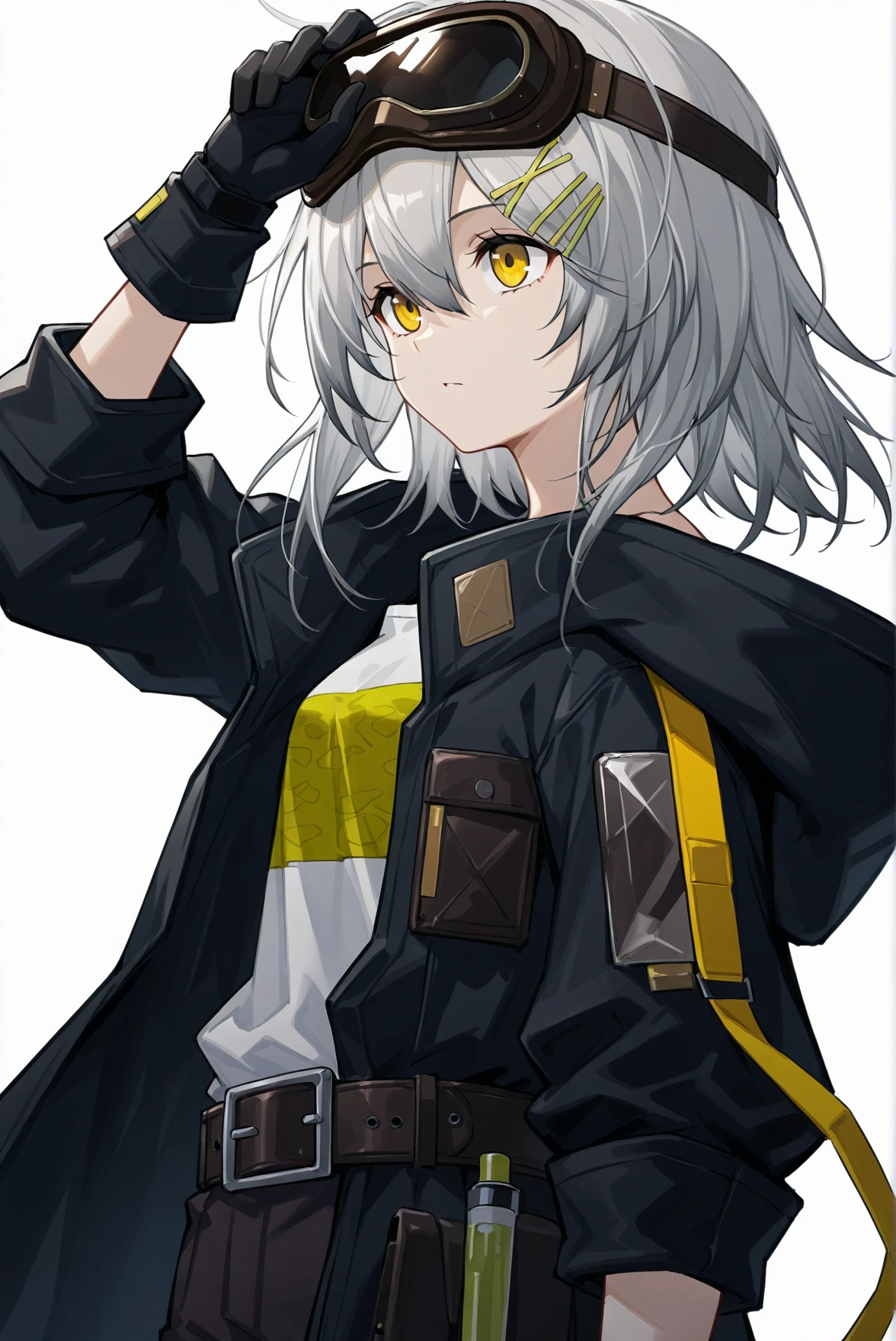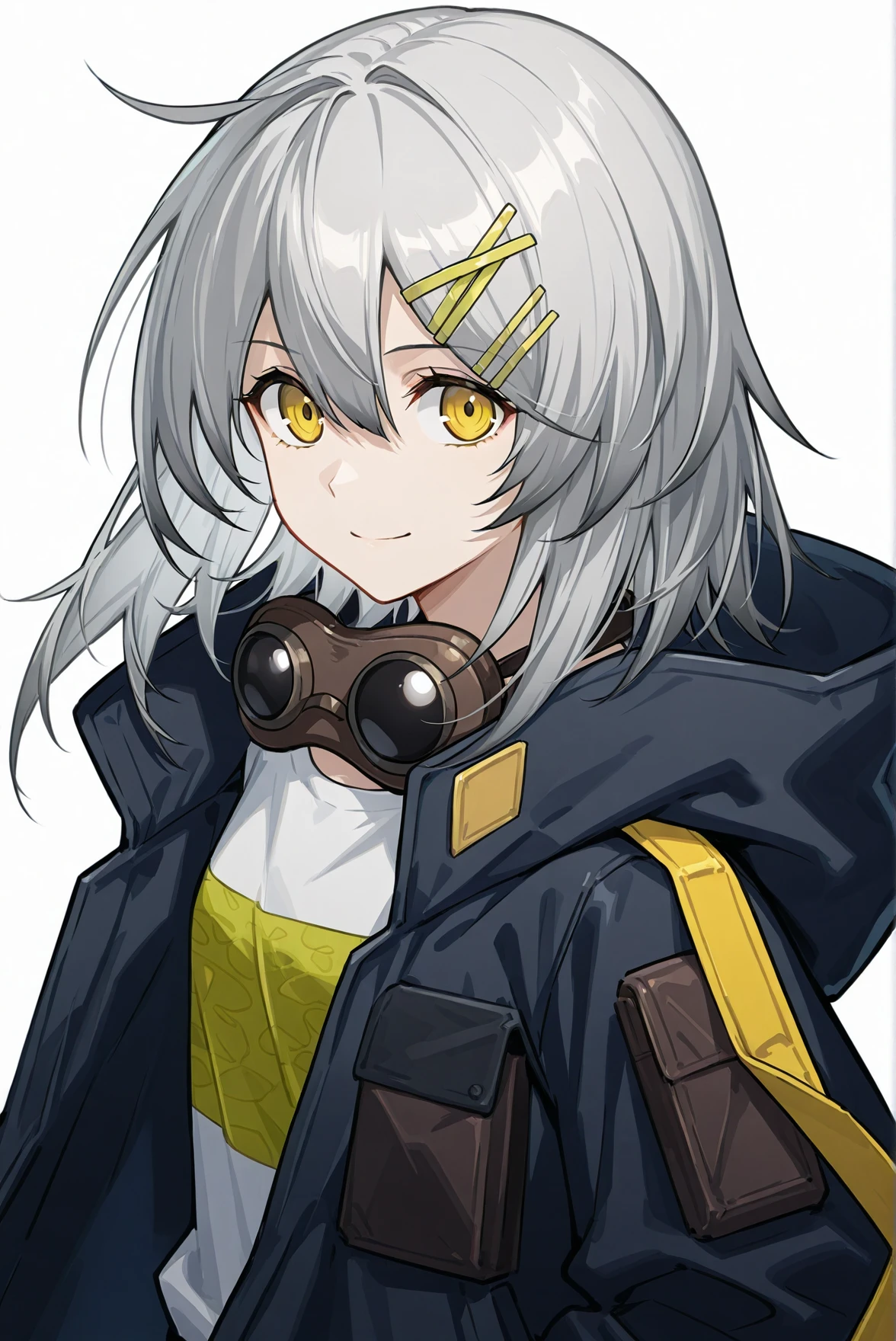 prompt: bangs, yellow eyes, silver hair, medium hair, hairclip, hair between eyes