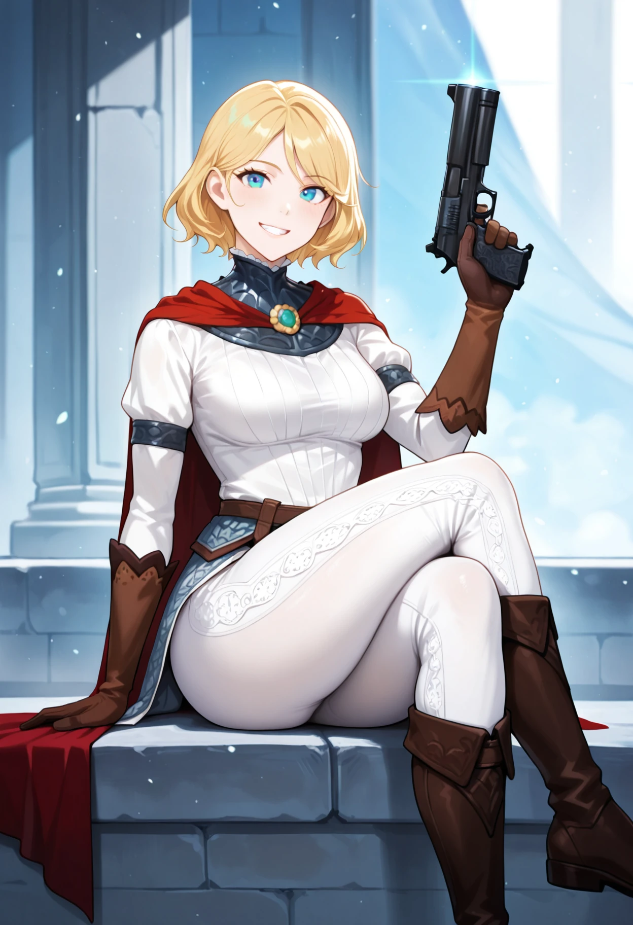 r0d3r1ka, blonde hair, cape, blue eyes, boots, red cape, gloves, short hair, brown footwear, white leggings, brown gloves