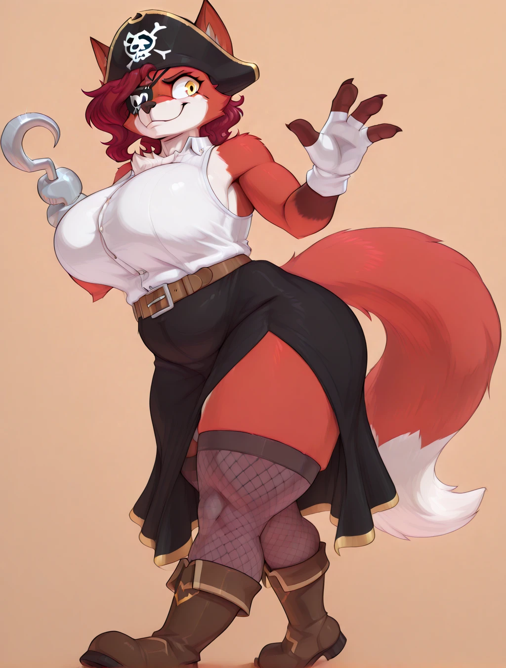 (Foxina Pirate, 1girl, solo, female, 3 fingers, fewer digits, bigger female, furry, furry female, anthro female, fox girl, fox ears, red inner ears, fox tail, red body, two-toned body, red fur, two-toned fur, red hand, red fingers, neck tuft, fluf, snout, animal nose, yellow eyes, dark-red hair, short hair, wavy hair, sidelocks, mature female, , curvy, chubby, , , hook hand, pirate hook, pirates hat, black eyepatch, left eyepatch, shirt, white shirt, line shirt, buttonedshirt, sleeveless, white collar, belt, brown belt, black skirt, pirate skirt, medium skirt, thighhighs, fishnet thighhighs, boots, brown boots, pirate boots, gloves, white gloves, 3 finger gloves, fingerless gloves)