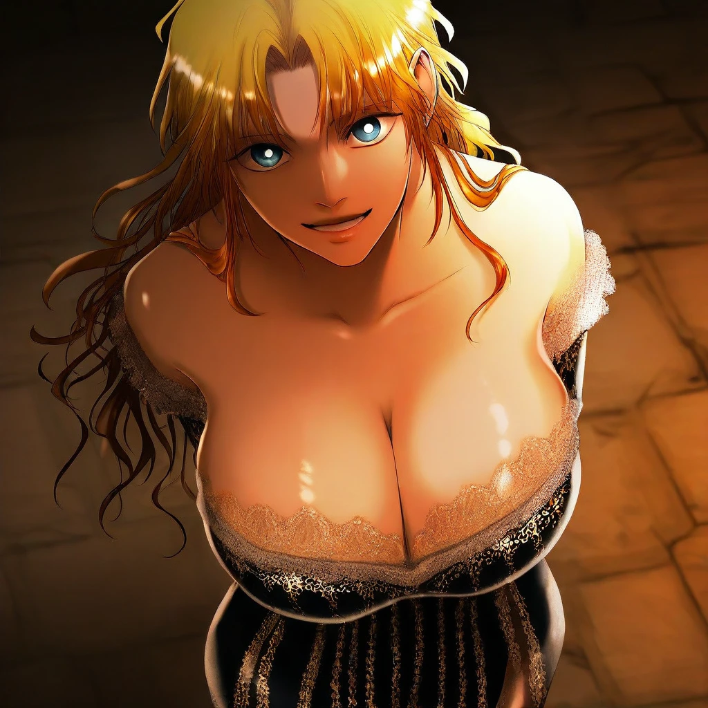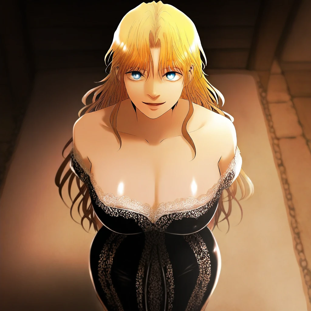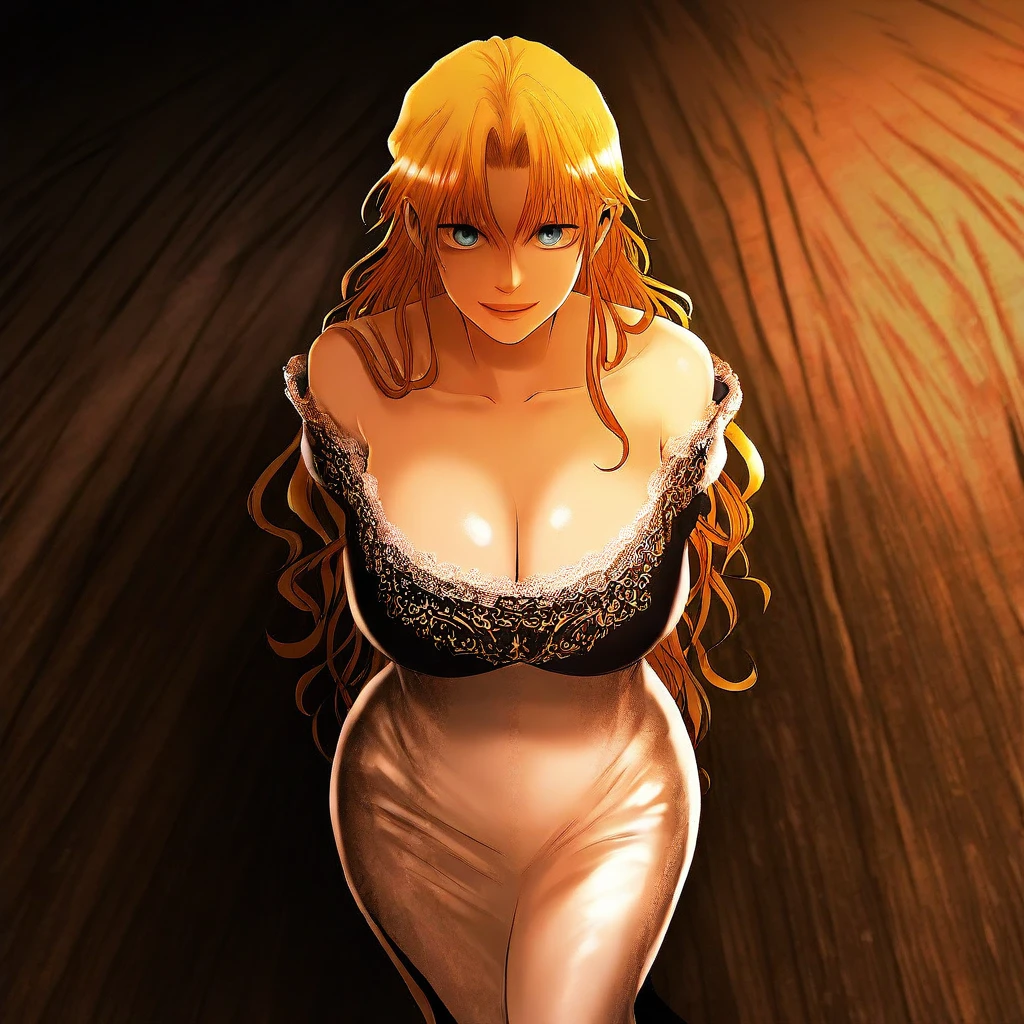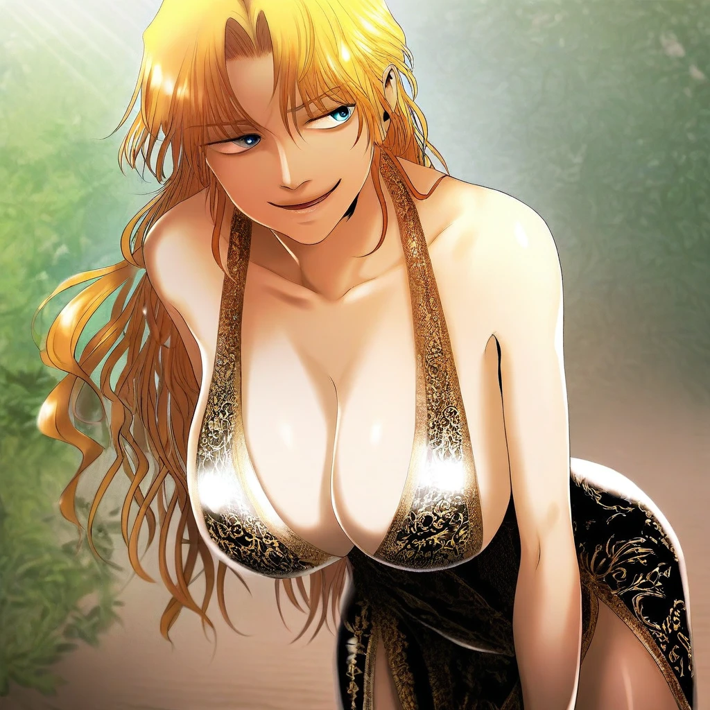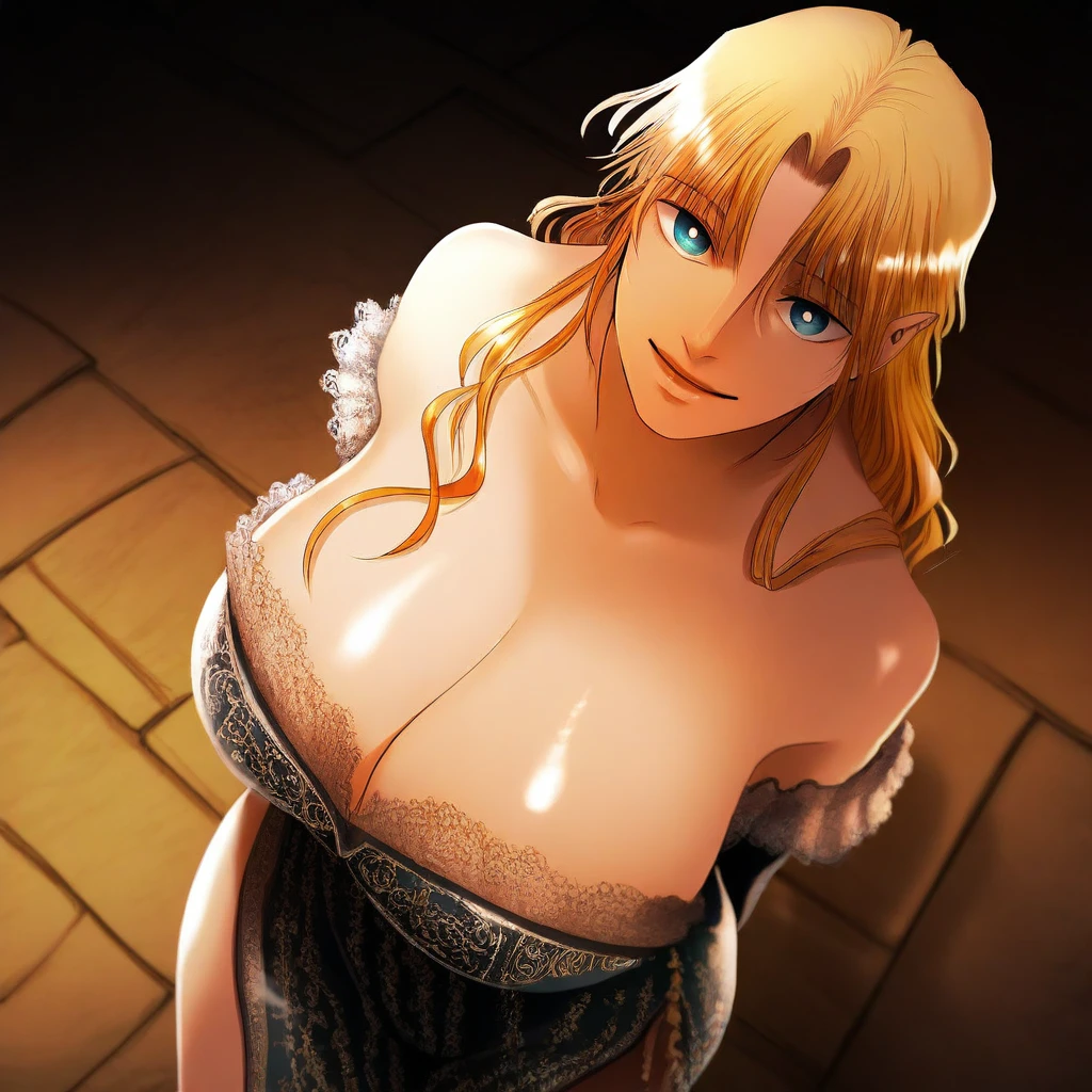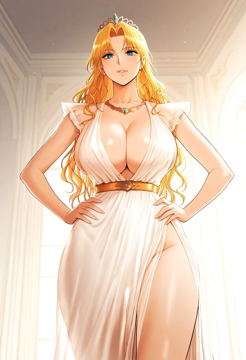 (( <lora:princess_damia:1> , princess_damia, thin waist, wide hips, beautiful skin, beautiful turquoise eyes, clear eyes, bright pupils, beautiful eyes, beautiful blonde hair, beautiful long hair, open curtain bangs, huge and shaggy breasts, natural beauty, extraordinary beautiful woman, attractive woman, super sexy woman, lustful body, sexy woman with seductive obscene body, sensual body, voluptuous body, sexy beauty, no piercings, no piercing, ))