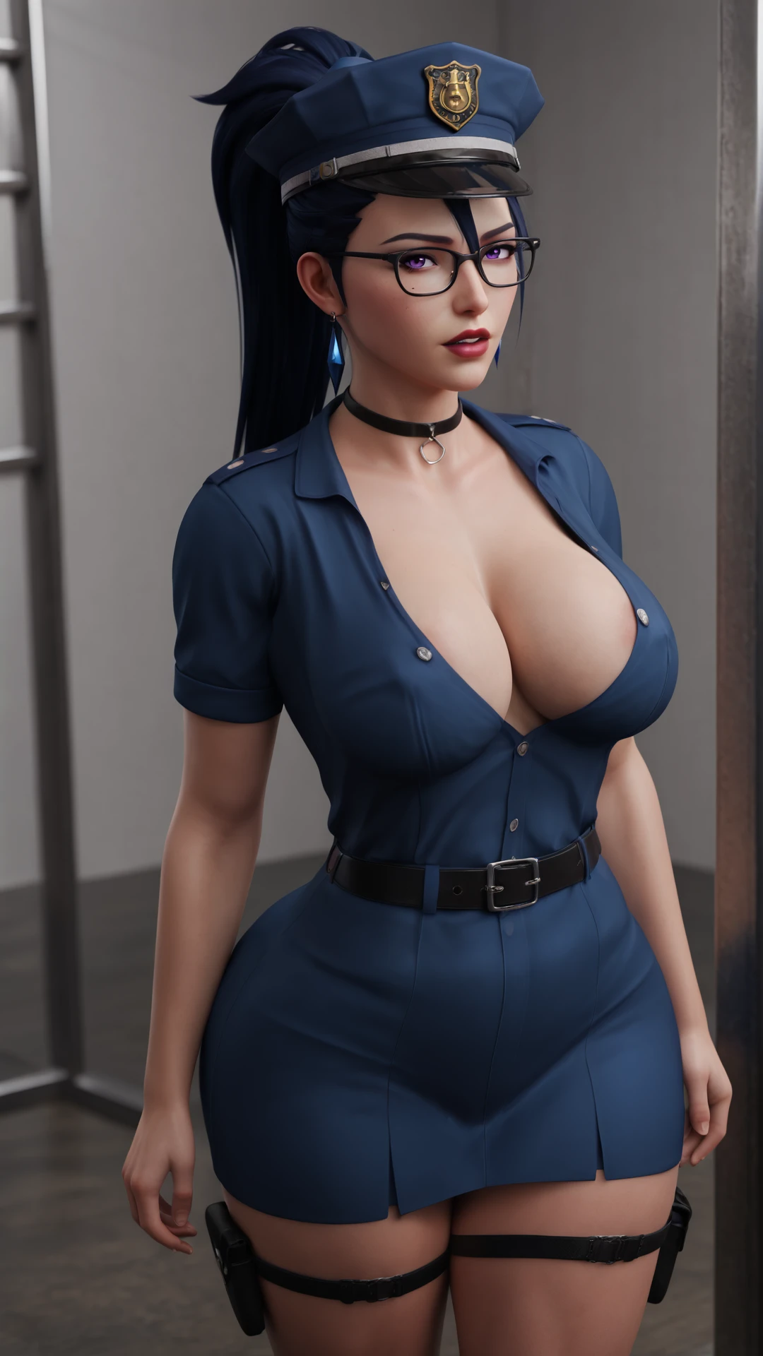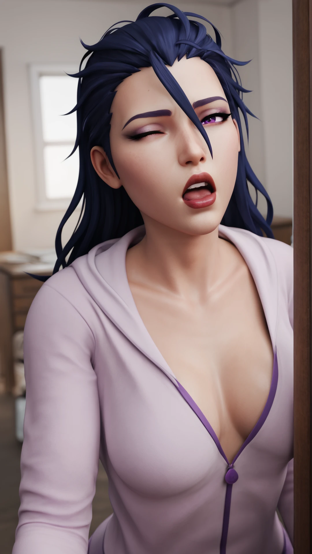 Tags for look : purple eyes, long hair, hair pulled back, ponytail, lipstick, hair between eyes, earrings