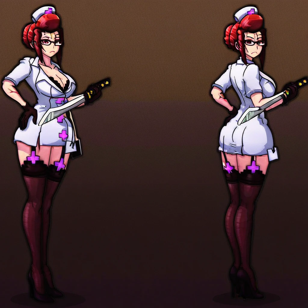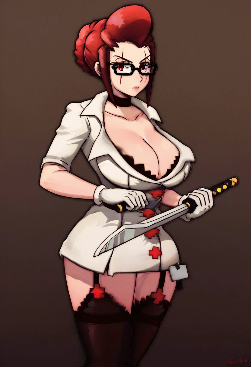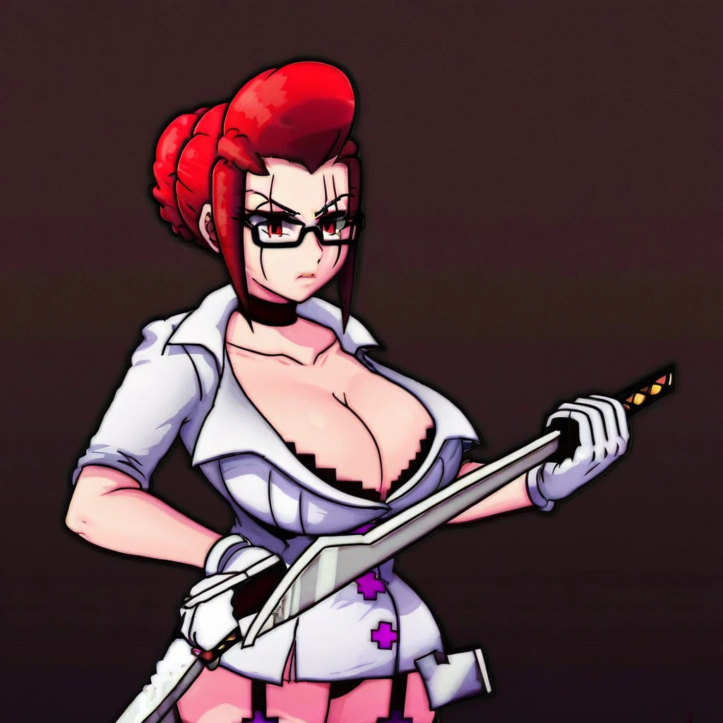 black-framed eyewear, white gloves, brown hair, lora christmas skullgirls, large breasts, gloves, black choker, cleavage, sword, makeup, scar, collarbone, huge tits, underwear, red eyes, garter straps, 1girl, red eyes, black bra, red hair, choker, hair bun, christmas skullgirls Show less