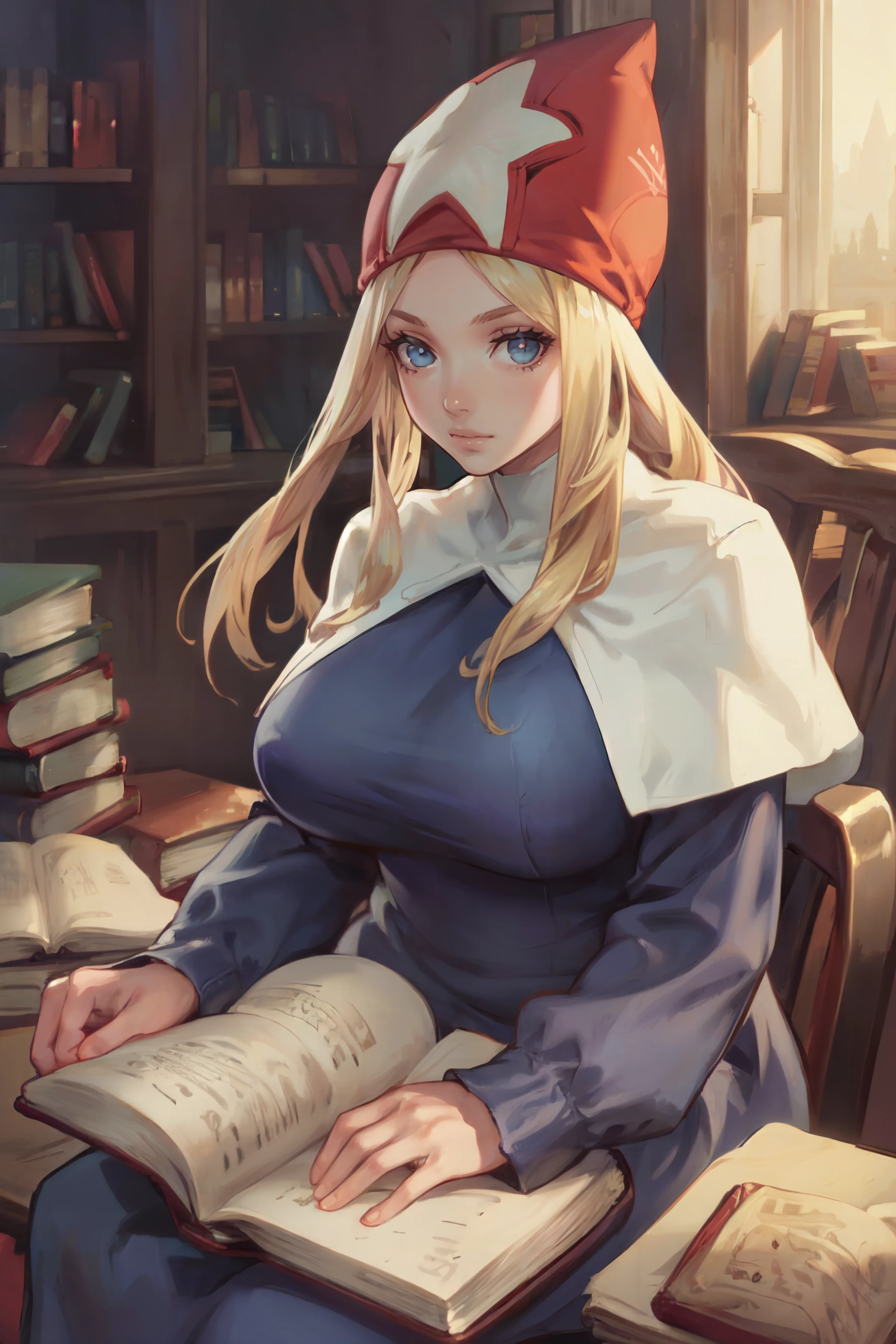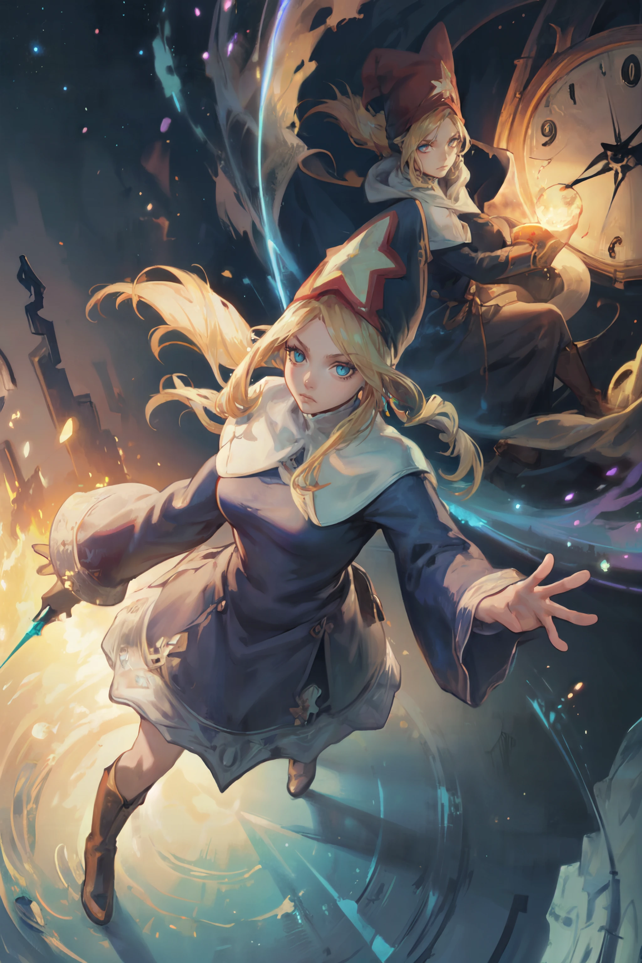 TimeMageFFT, blonde hair, long hair, sidelocks, hat,((long dress)), capelet, boots,